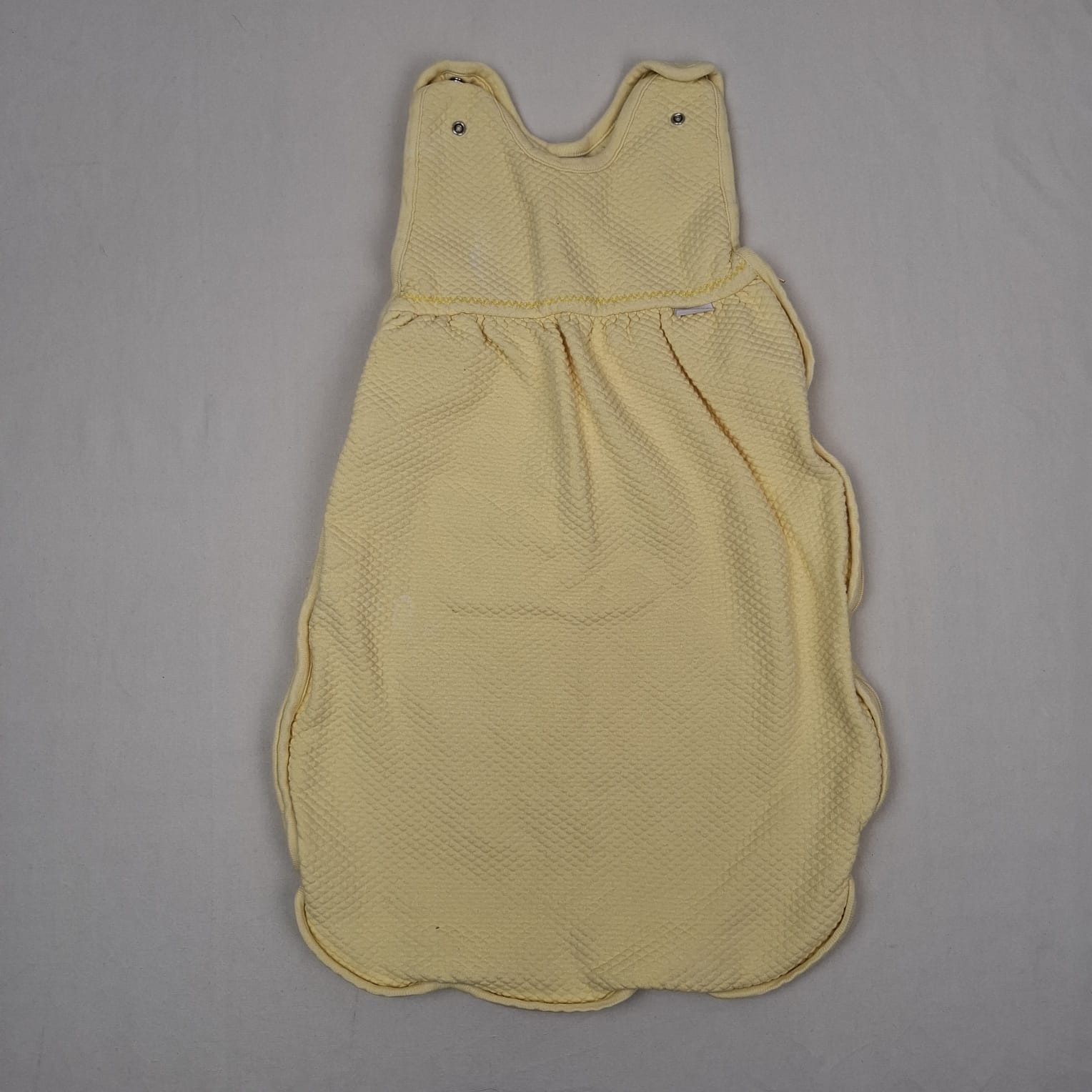 Autres commentaires : Gigoteuse jaune sans manches, ouverture par zip, hauteur des brettelles réglables par boutons pression. Taille 4-9M