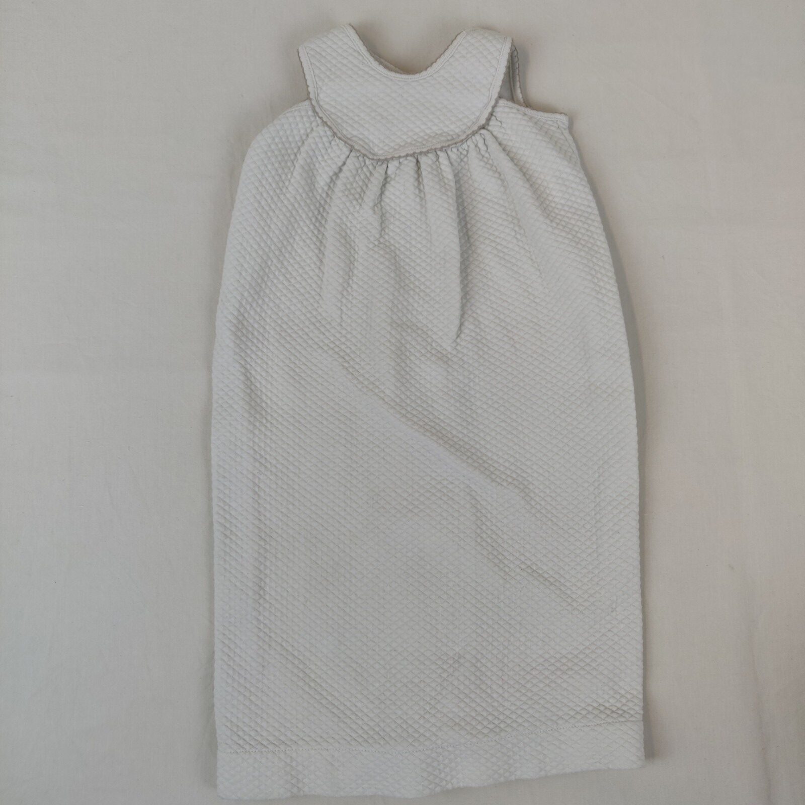 Autres commentaires : 7% polyester. Gigoteuse sans manche légère à molleton matelassé blanc (O – 6 mois). Ouverture centrale au dos à scratchs. Ouverture dans le bas à pressions. Tâche jaune dans le haut au dos. Niveau réduit de fraise à myrtille.