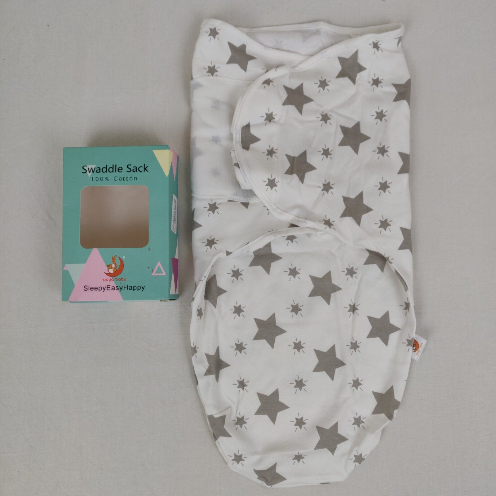 Autres commentaires : Couverture d’emaillotage bébé avec motif des étoiles grises et fermé par scratch. Taille: 0 à 3 mois.