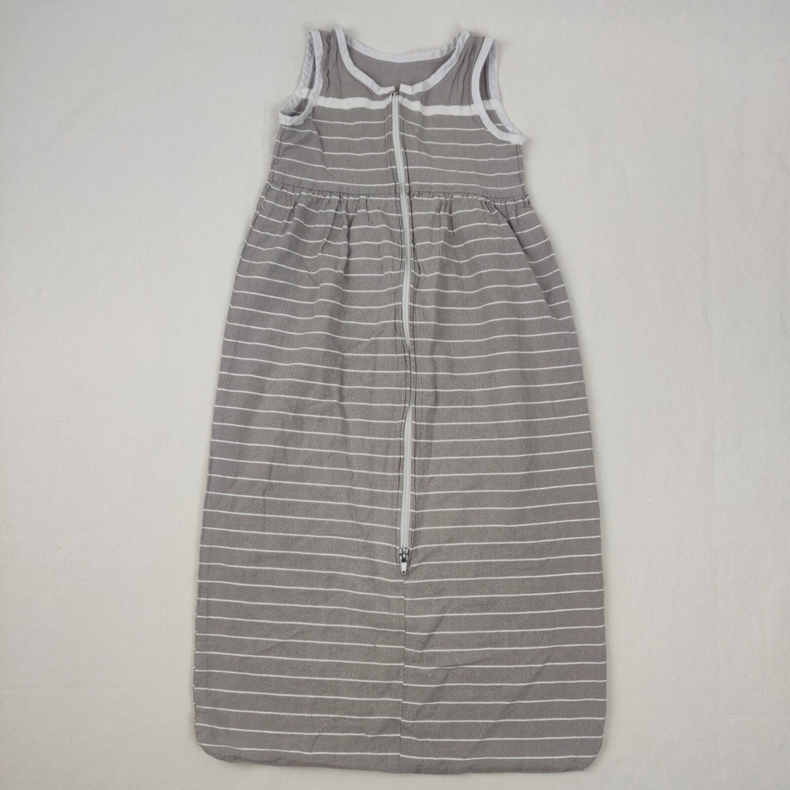 Autres commentaires : Gigoteuse ou turbulette gris légère sans manches avec rayures blanches et une fermeture en zip centrale.