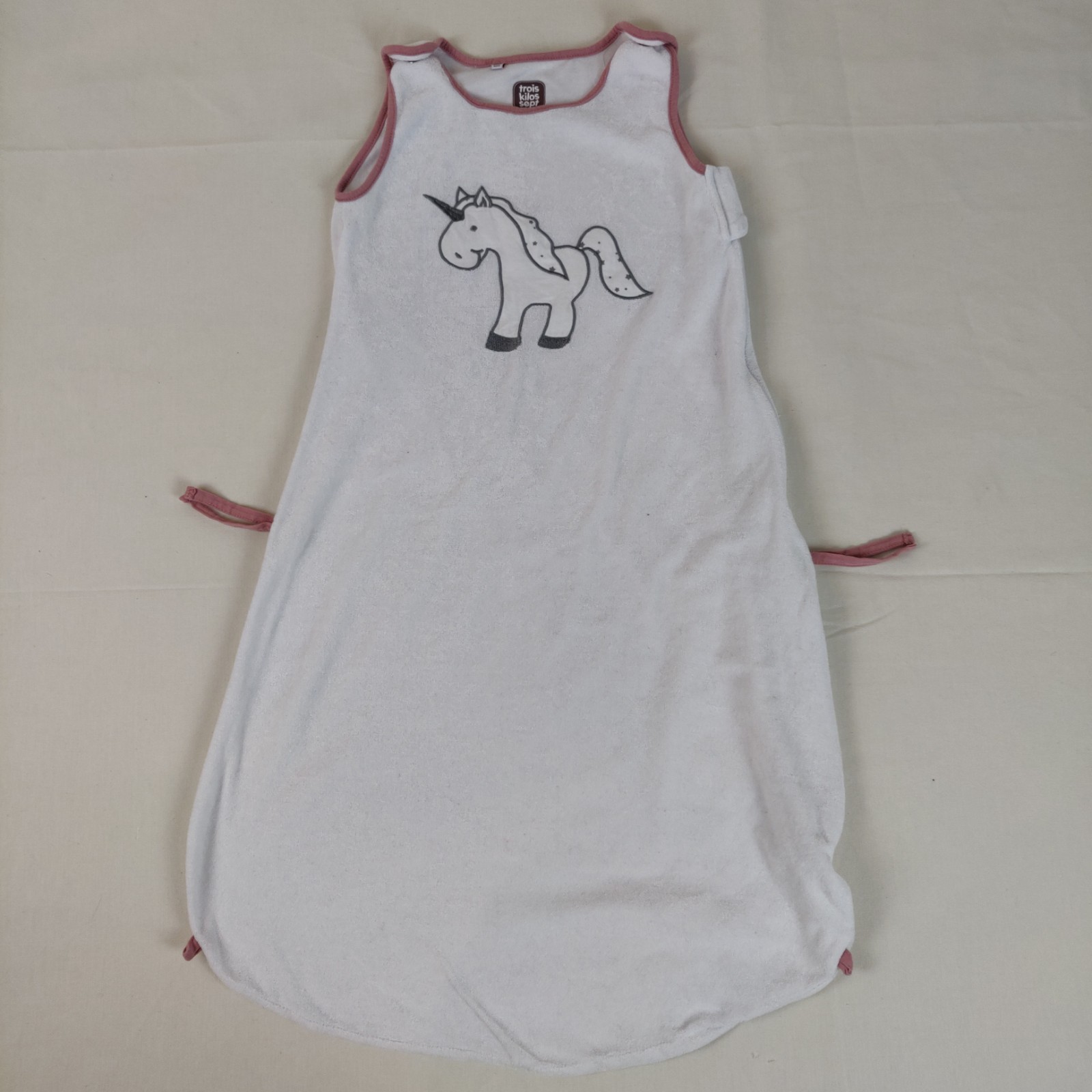 Autres commentaires : 20% polyester. Gigoteuse ou turbulette sans manche en éponge velours – écru avec motif central blanc et argenté licorne. Ouverture latérale et en dessous à fermeture éclair. Bretelles s’attachant avec des boutons pression. Sytème d’attache avec un bouton pression central et des rubans latéraux pour raccourcir la turbulette.