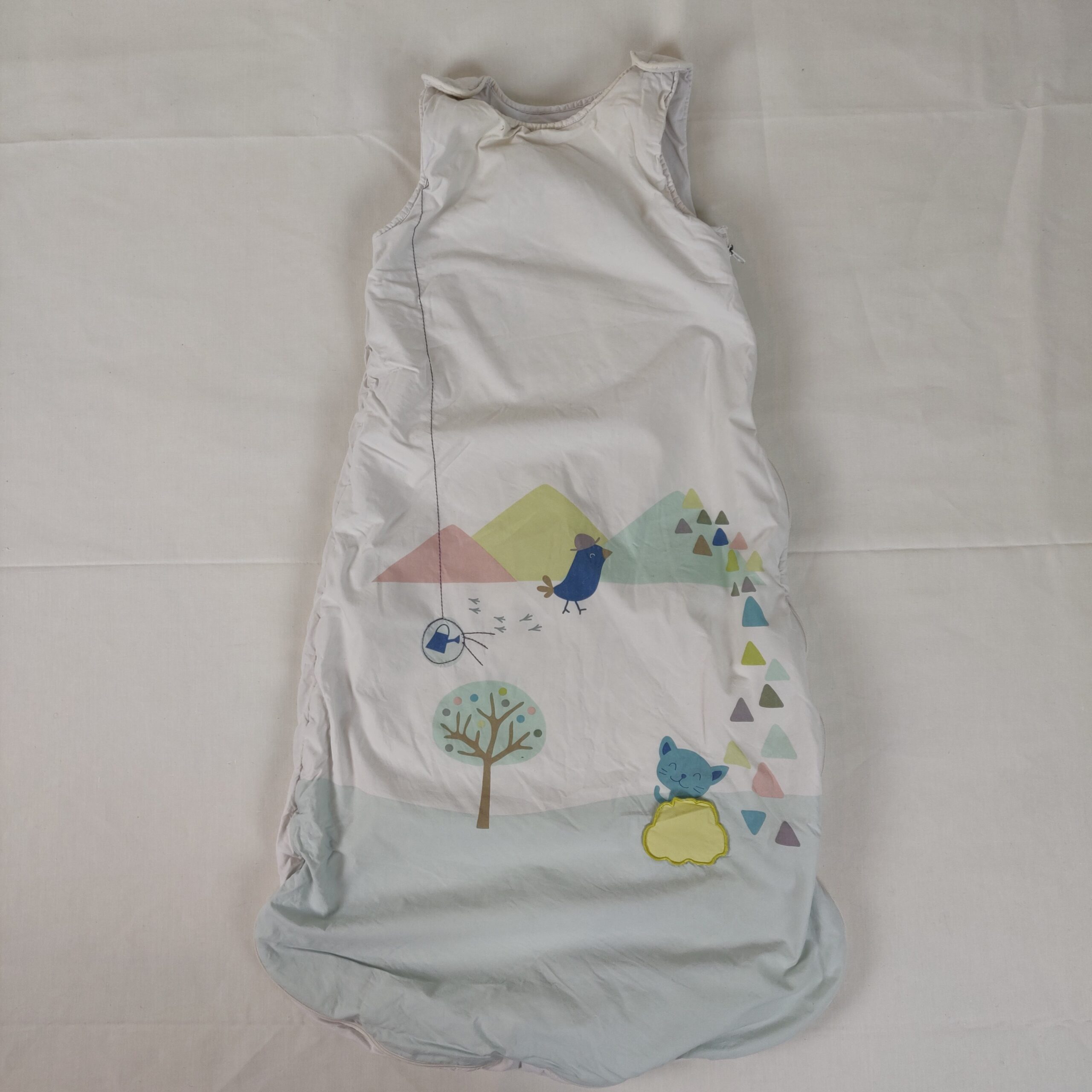 Autres commentaires : Turbulette blanche avec boutons pression aux épaules et fermeture éclair. Motifs oiseau, chat, nuage multicolores. (taille grand 2 ans +). Niveau baissé de fraise à myrtille dû au col jauni.