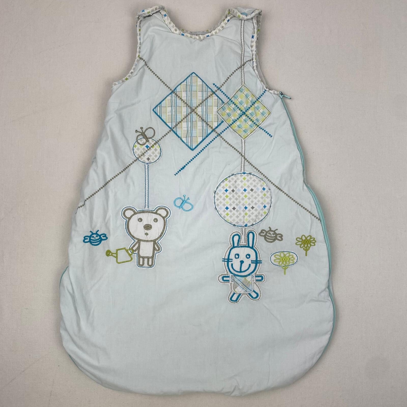 Autres commentaires : Gigoteuse bleu clair avec remlissage, motif lapin et ours, fermeture éclair sur le côté droit et en bas, fermeture par boutons pression sur les épaules, 62 cm de long.