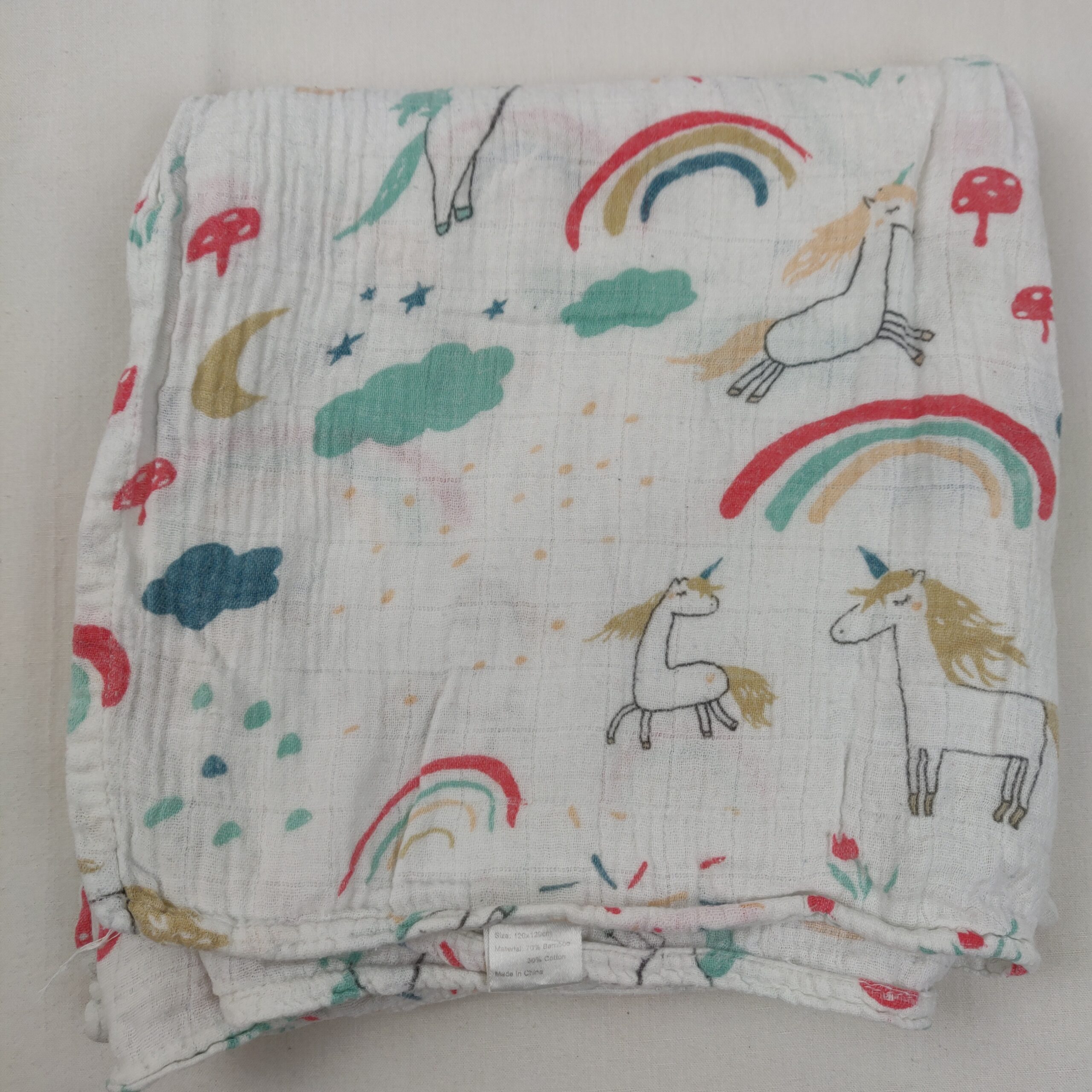 Autres commentaires : 30% coton, maxi lange en mousseline, blanc motifs licornes et arcs-en-ciel