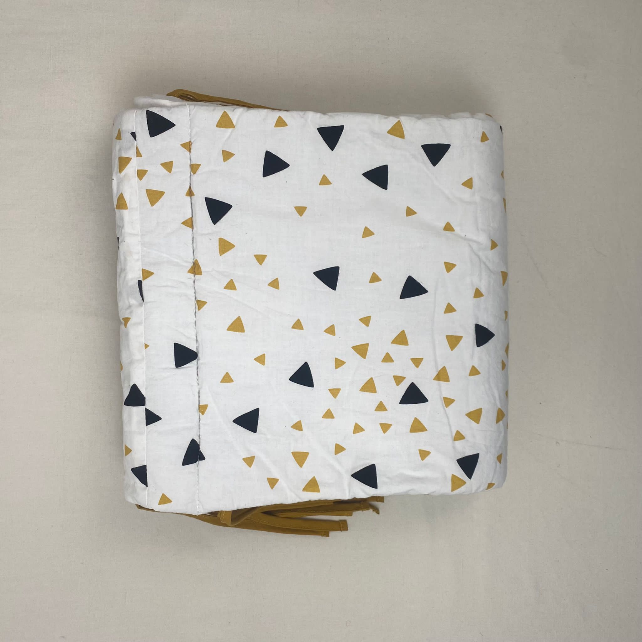 Autres commentaires : Tour de lit blanc parsemé de petits triangles jaune moutarde et noirs.