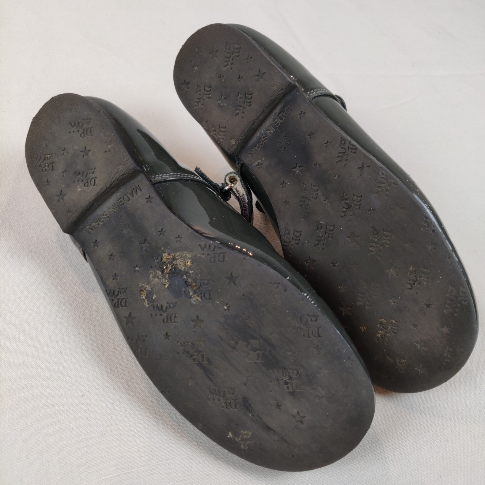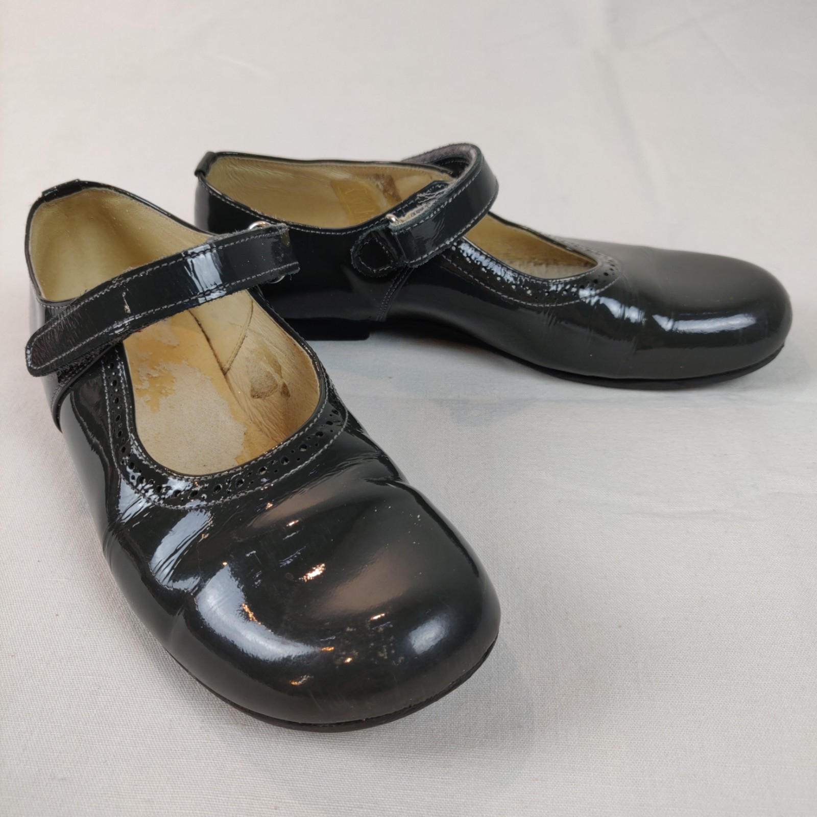 Autres commentaires : Salomés vernies à bande sratch – gris. Ouverture centrale ornée d’une fine bande avec des points ajourés.