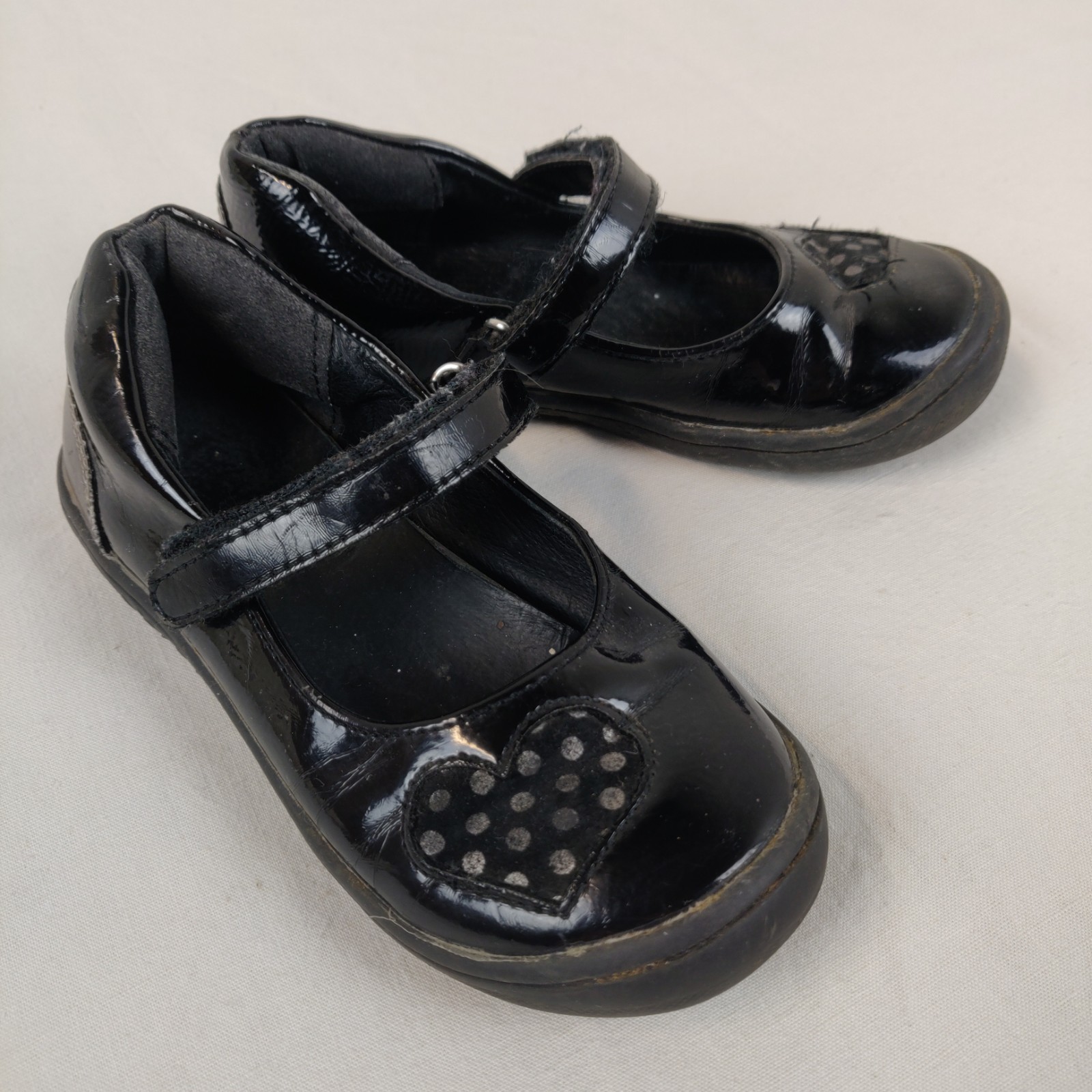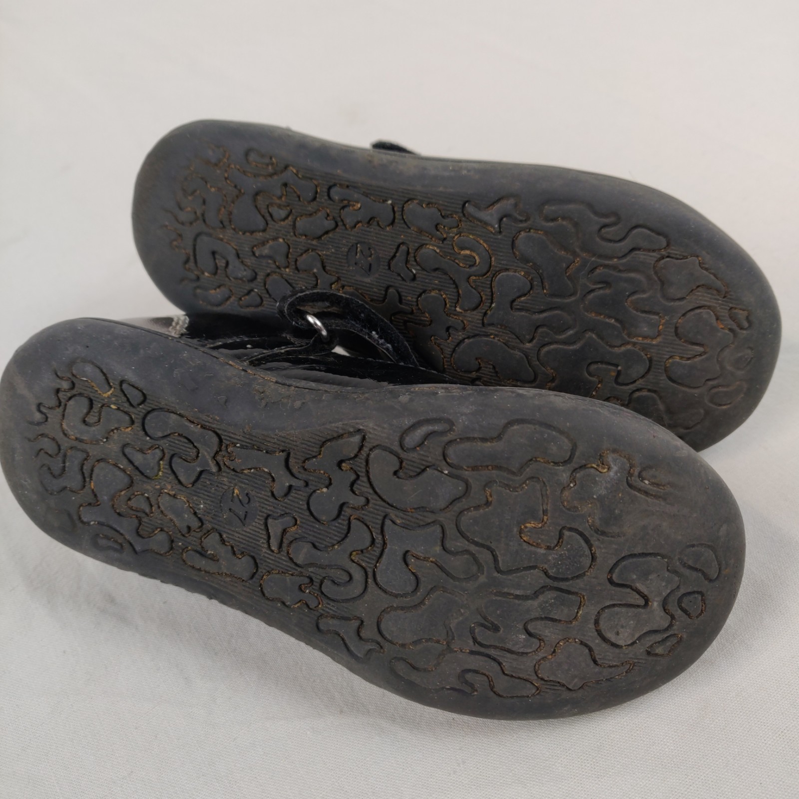 Autres commentaires : Ballerines vernies – noir. Coeur central en tissu à pois argentés. Languette centrale à scratch. Usure normale.
