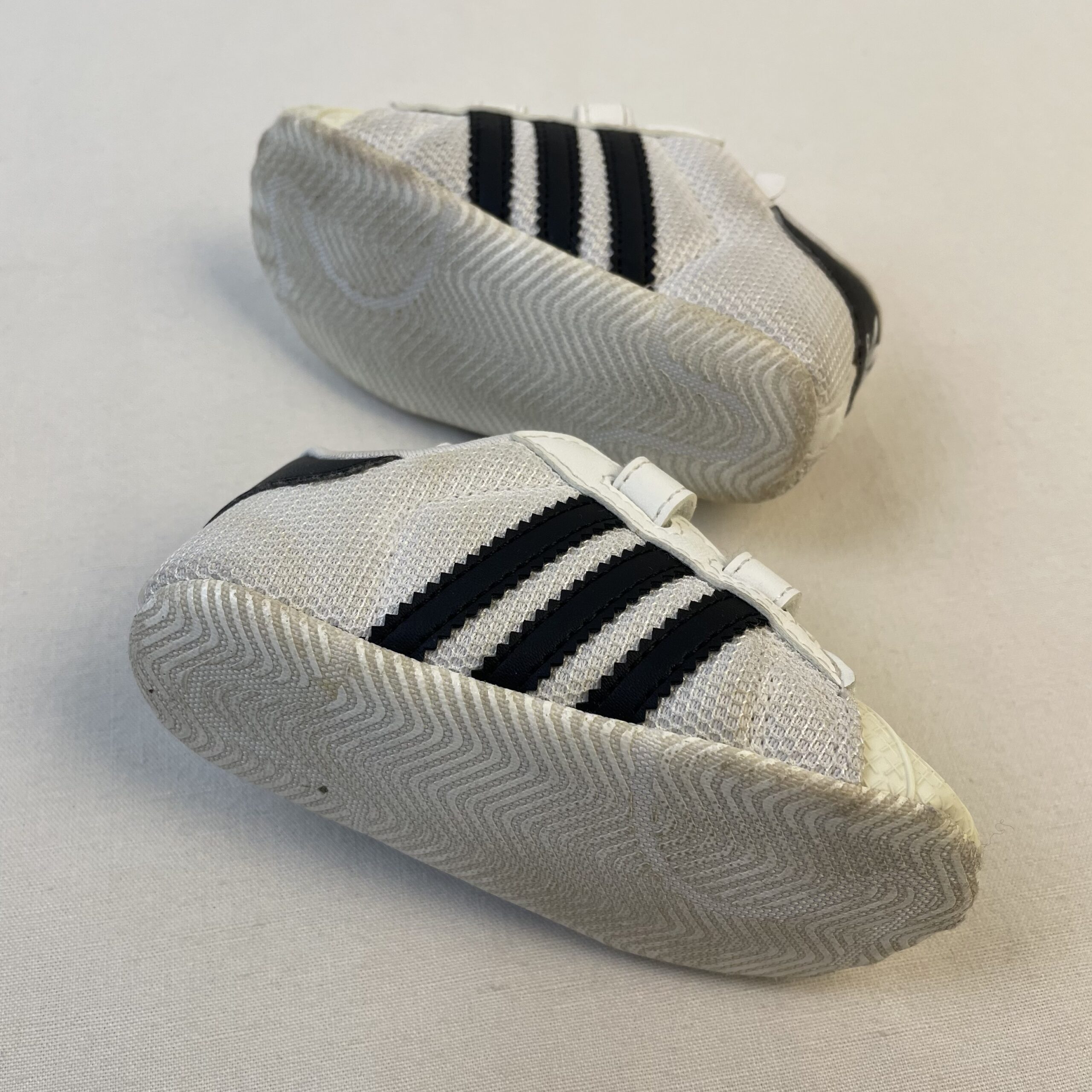 - Baskets adidas blanches à bandes noir. Des scratchs permettent de l’enfiler et de la retirer facilement.
