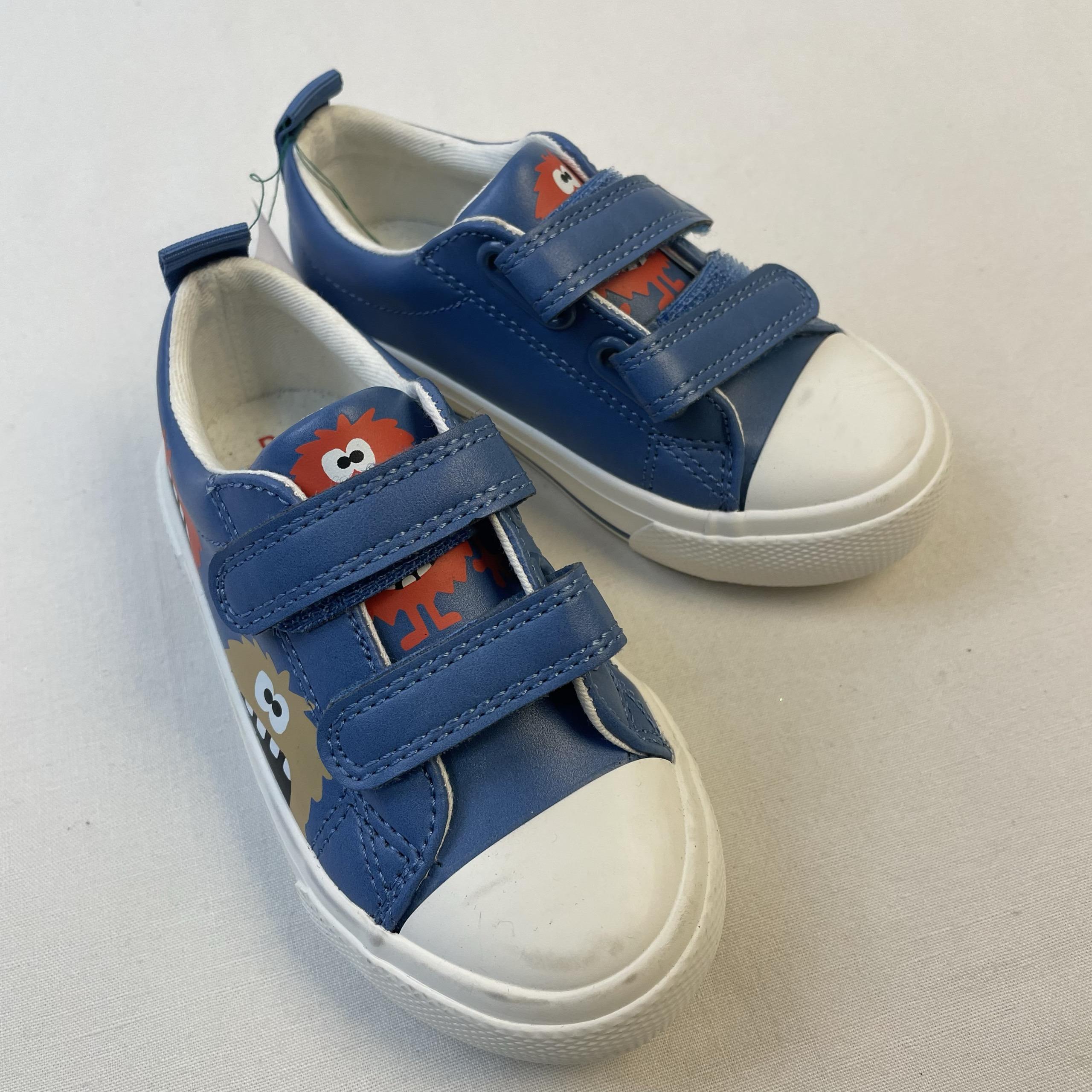 - Baskets bleues à motifs monstres. Des scratchs permettent de l’enfiler et de la retirer facilement.