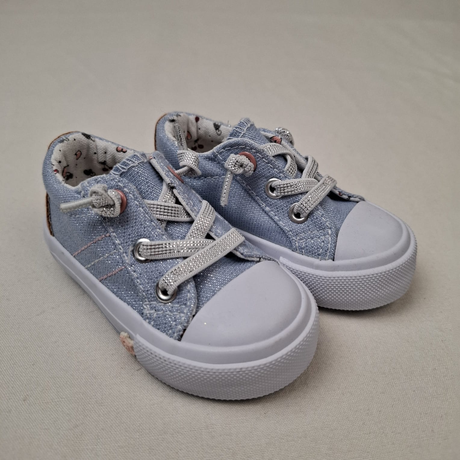 Autres commentaires : Baskets bleu en paillettes, fermeture par lacets élastiques.