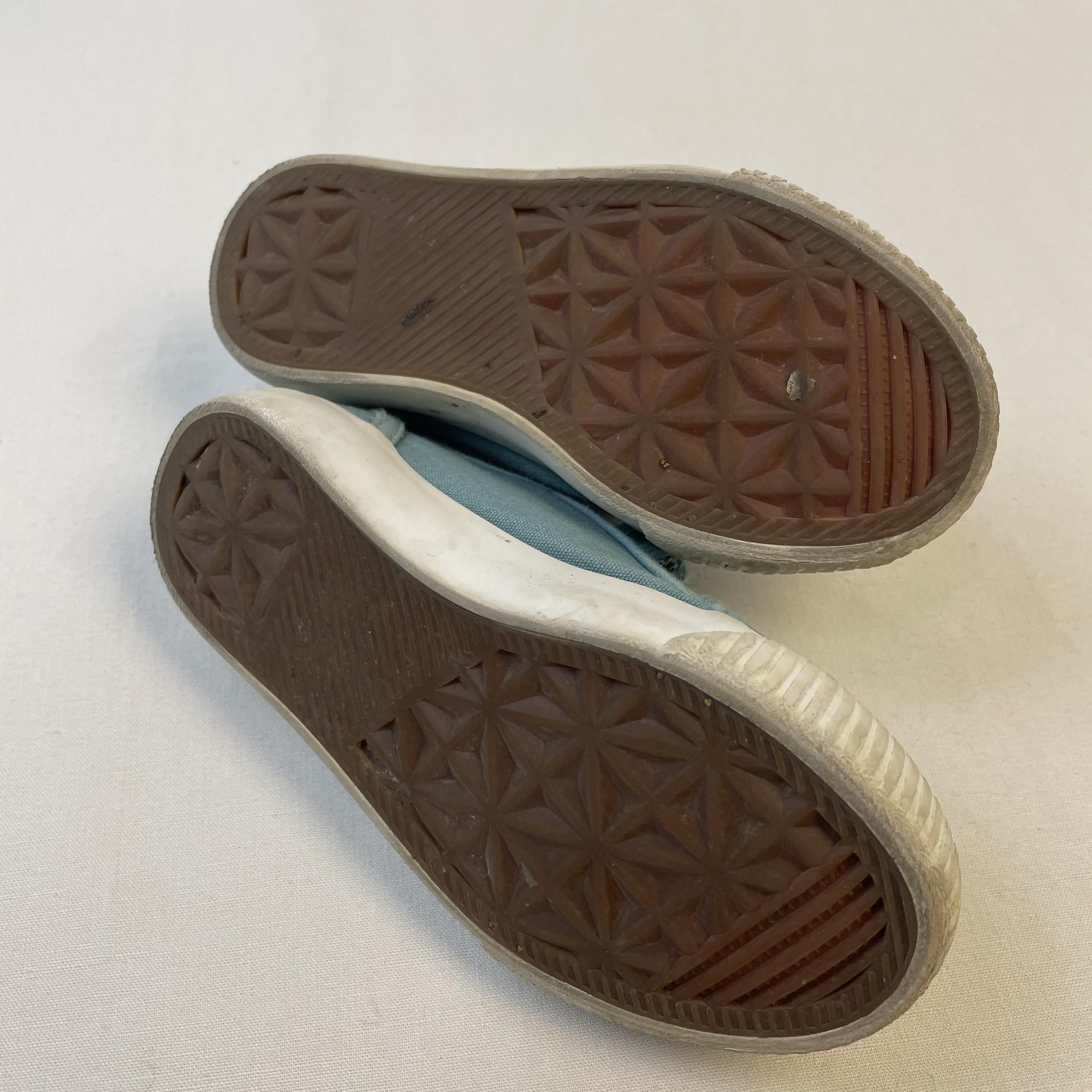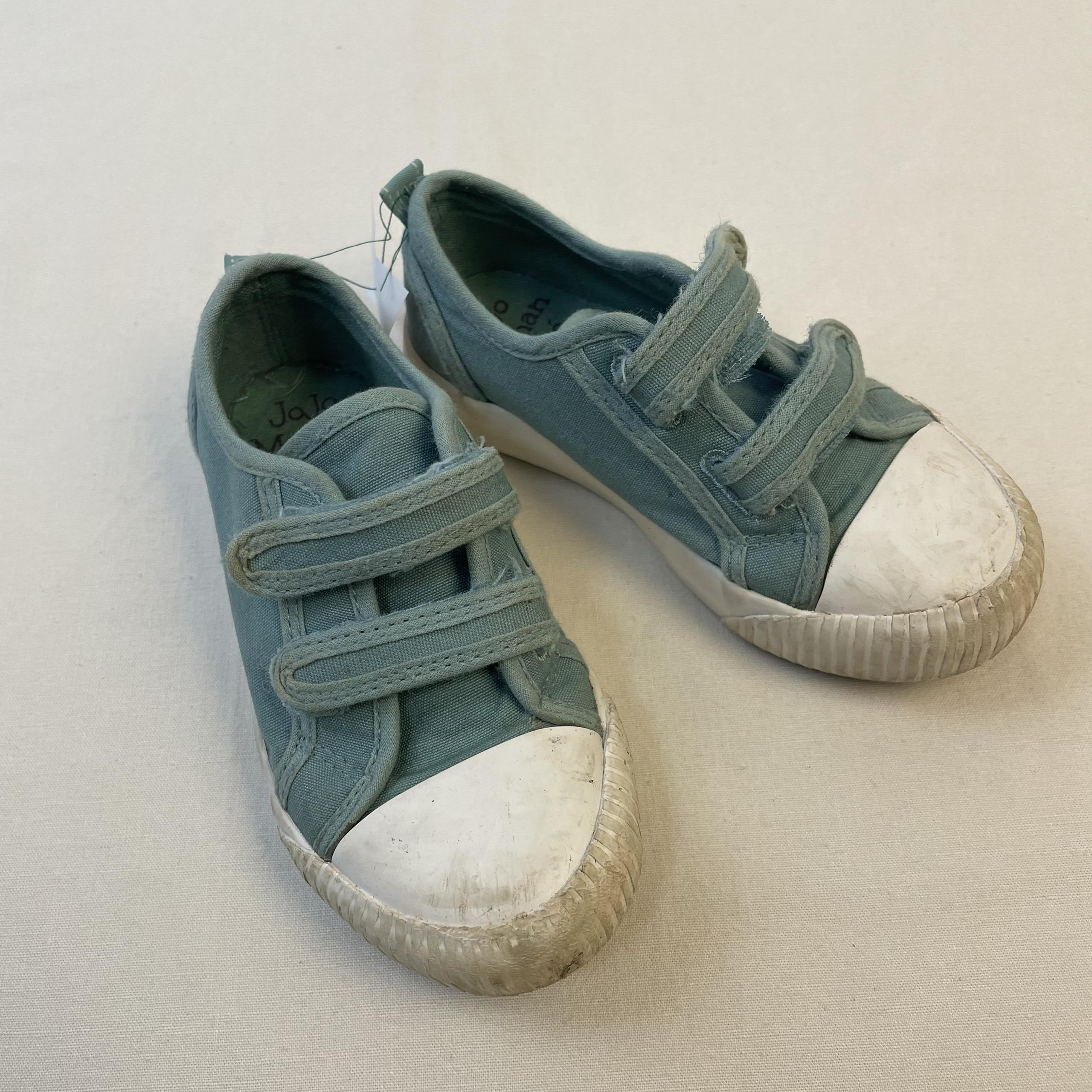 - Baskets vertes unies. Des scratchs permettent de l’enfiler et de la retirer facilement.