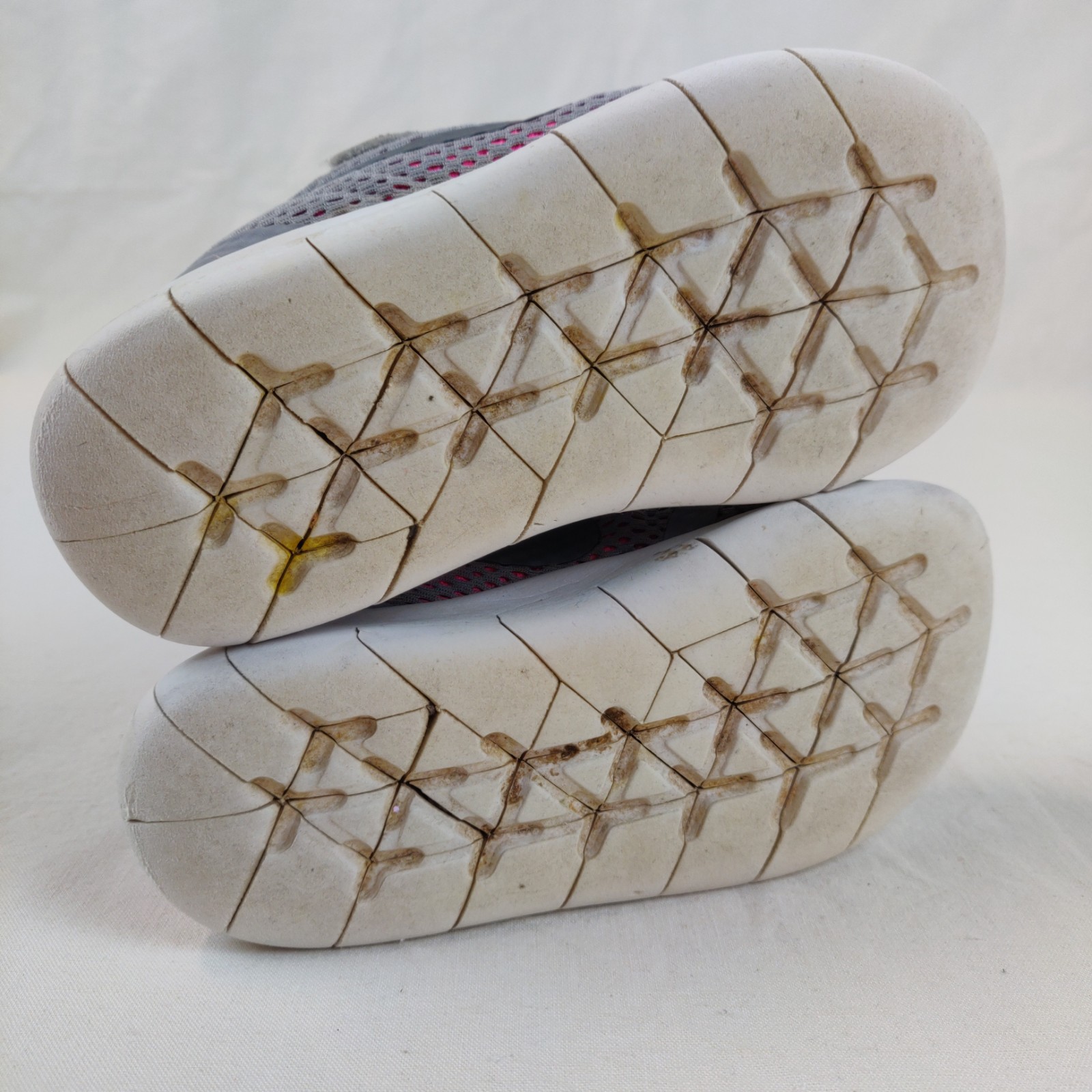 Autres commentaires : Baskets en tissu respirant gris. Base du dessous rose. Virgules latérales de la marque. Lacets décoratifs. Ouverture à scratch. Baskets bien portées : niveau réduit de fraise à myrtille.