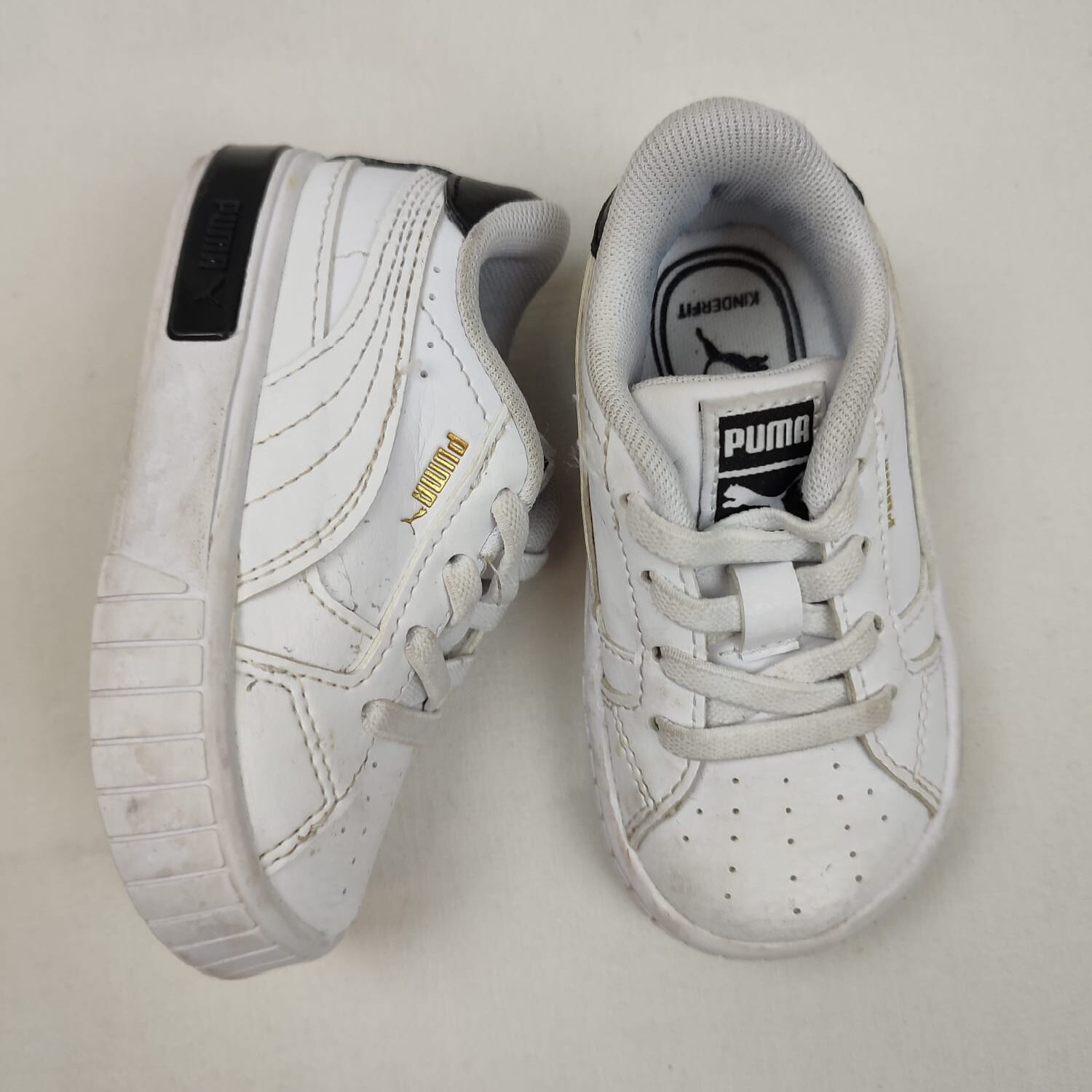 Autres commentaires : Paire de baskets blanches à lacets élastiqués, logo Puma doré rappelé sur le côté, semelles blanches.