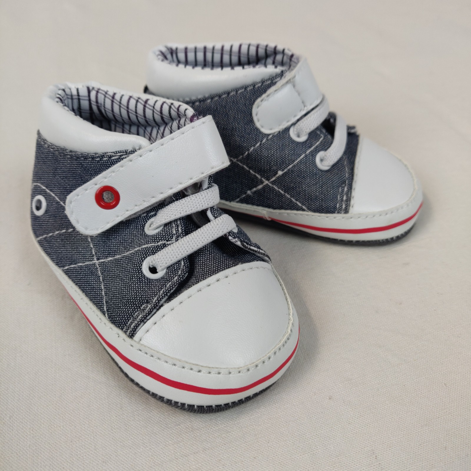 Autres commentaires : Baskets montantes totalement en tissu – bleu-gris et blanc. Bande rouge au niveau de la semelle. Ouverture à scratch.