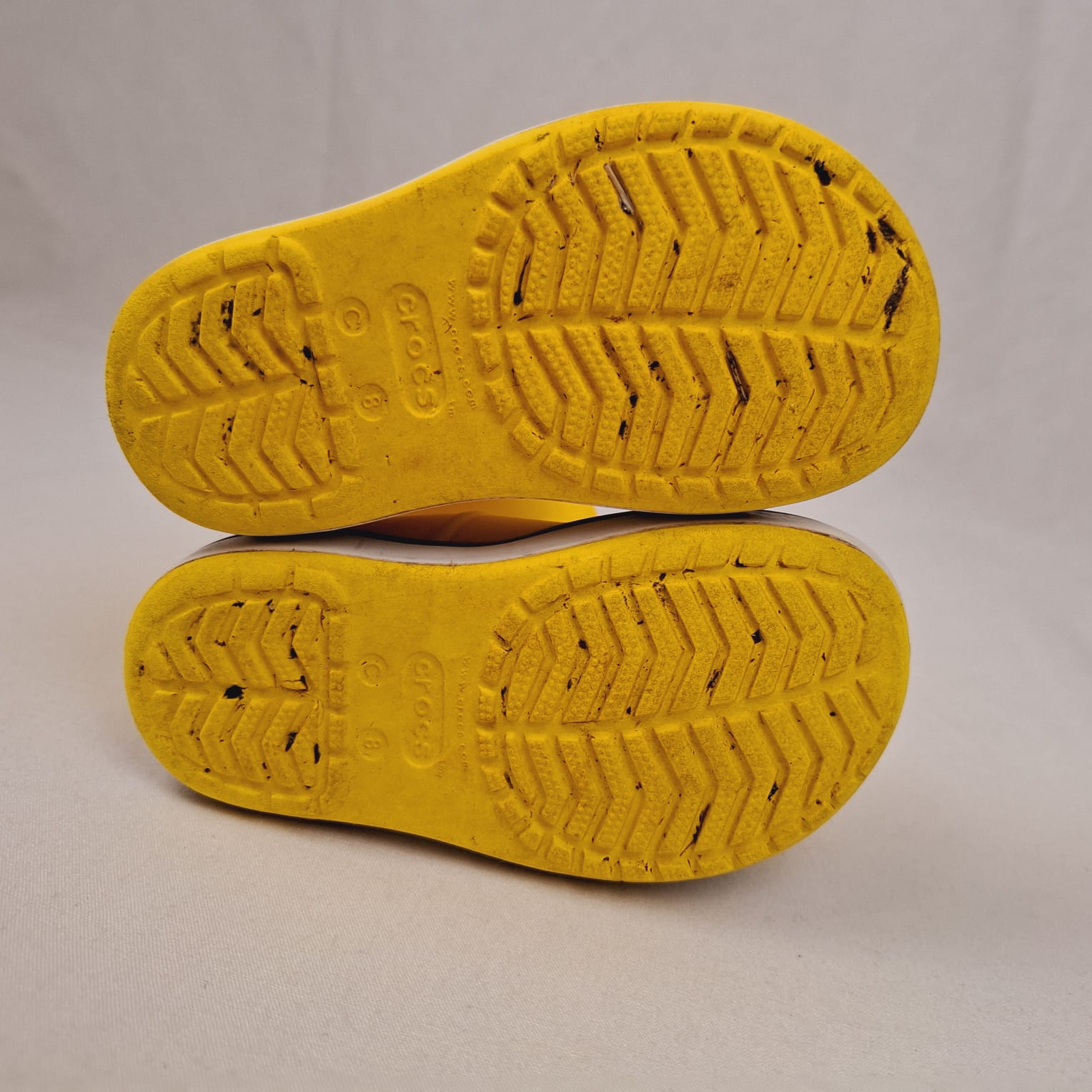 Autres commentaires : Botte de pluie jaune crocs, semelle en bon états, quelques marques d’usure sur la paire de droite, estimé a du 25