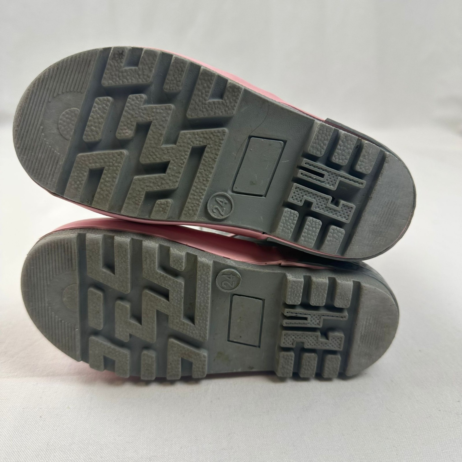 Autres commentaires : Bottes de pluie rose et gris avec des petits points et motif un animal.