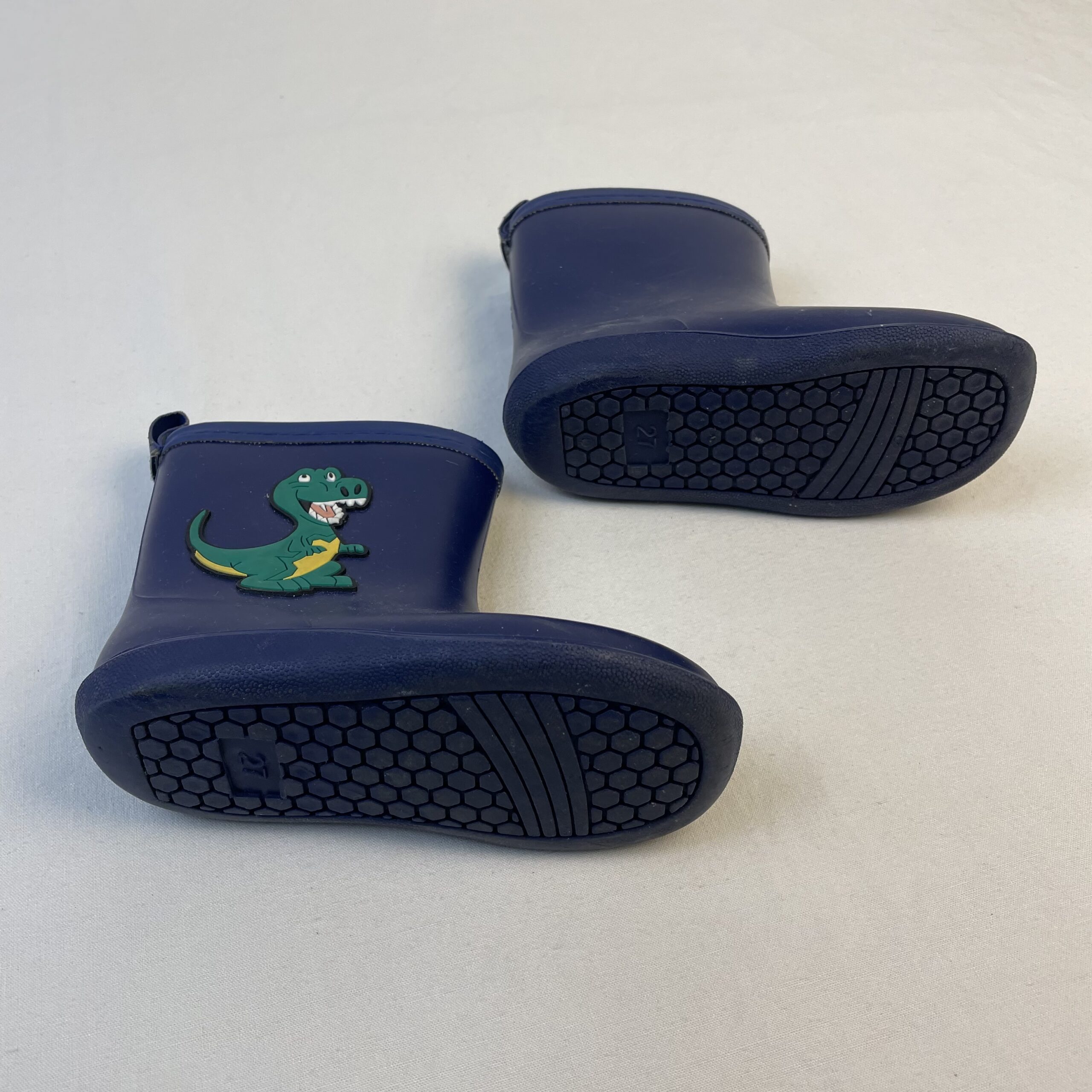 - Bottes de pluie bleu marine, motif dinosaure T-rex vert et jaune en latéral.