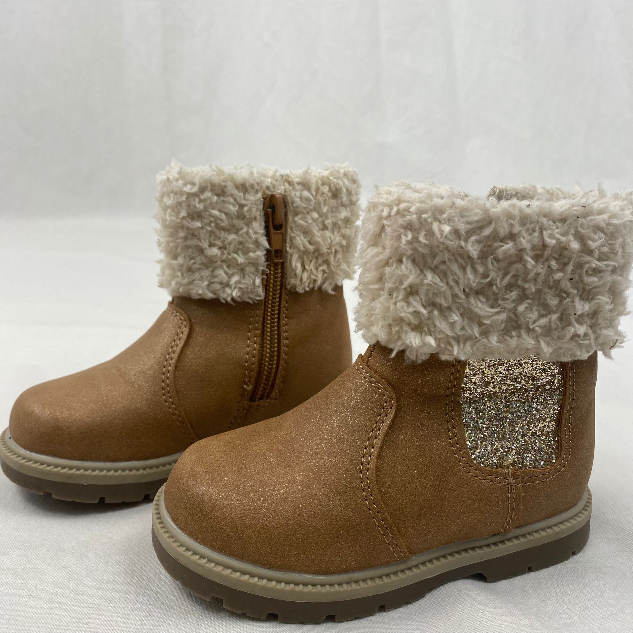 Autres commentaires : Bottes en matière effet daim, détails pailletés sur le côté et intérieur en fausse fourrure beige. Fermeture par zip sur le côté intérieur. Semelle crantée. Très bon état.