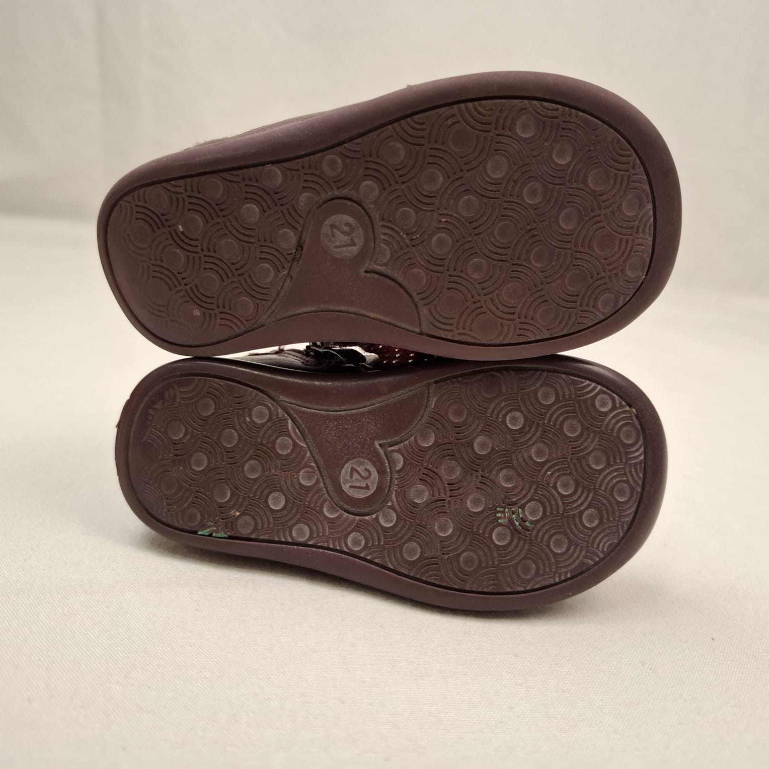 Autres commentaires : Bottines mauves, fermeture par lacets et par zip, légerement usées à l’avant de la chausssure