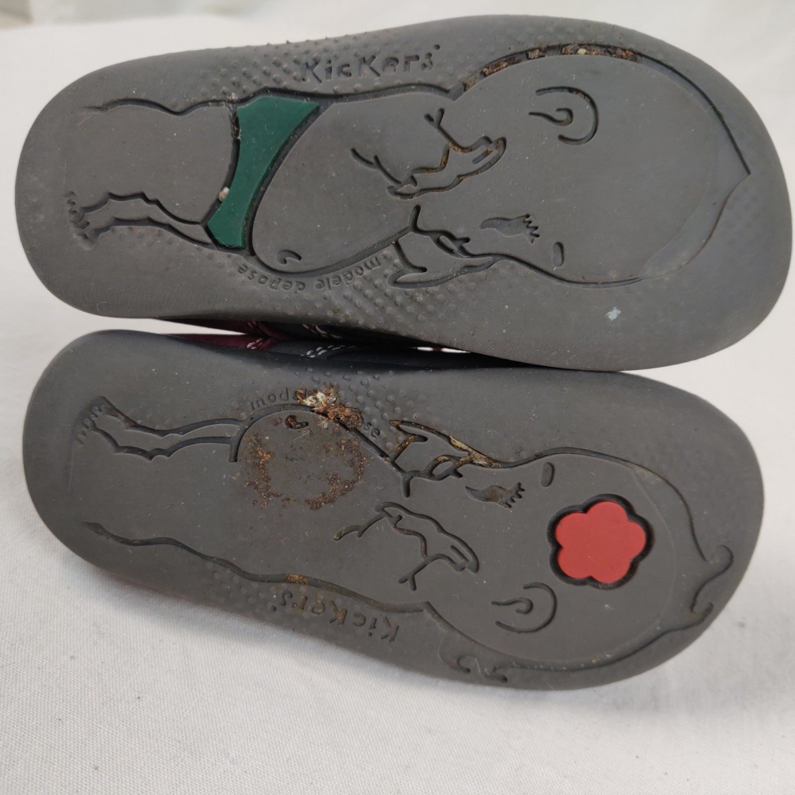 Autres commentaires : Bottines – gris foncé, rose et rose fuschia. Ouverture centrale à lacets. Marques d’usure. Niveau réduit de kiwi à myrtille.