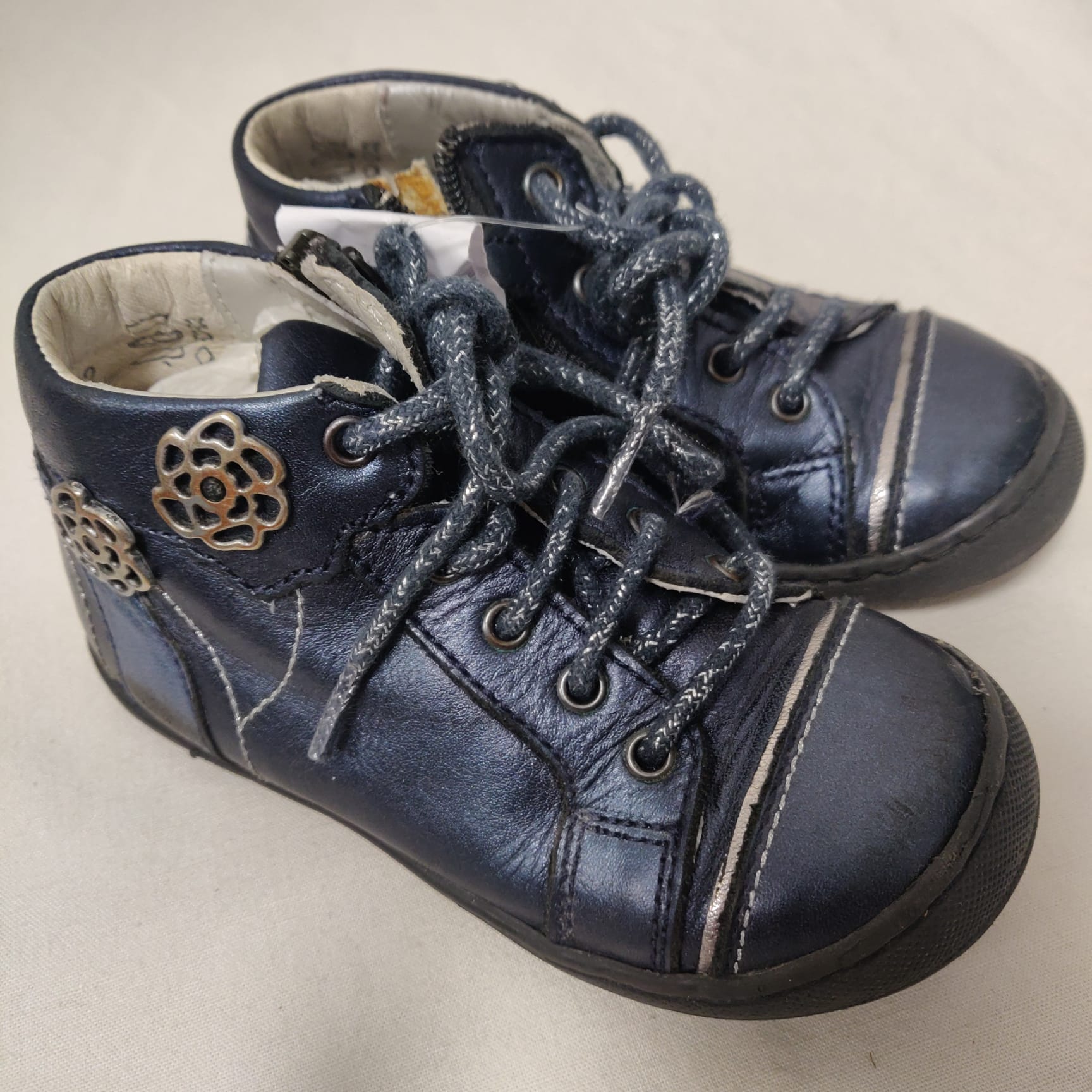 Autres commentaires : Bottines bleu argent à lacets et fermeture éclair. Un peu frottées sur les côtés. Niveau réduit de Banane à Kiwi