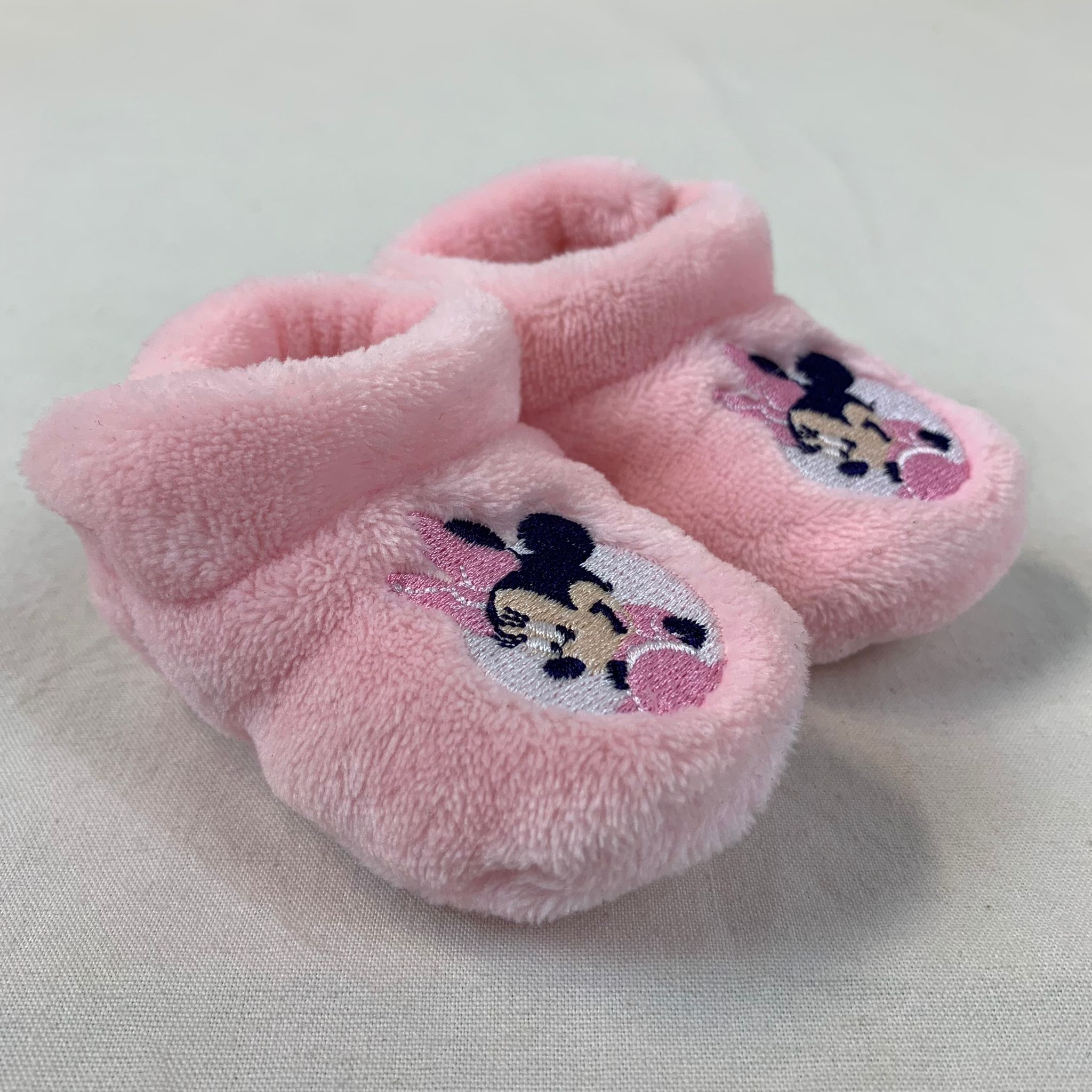 Autres commentaires : Chausson rose avec une illustration de Mickey Mouse à scratch.