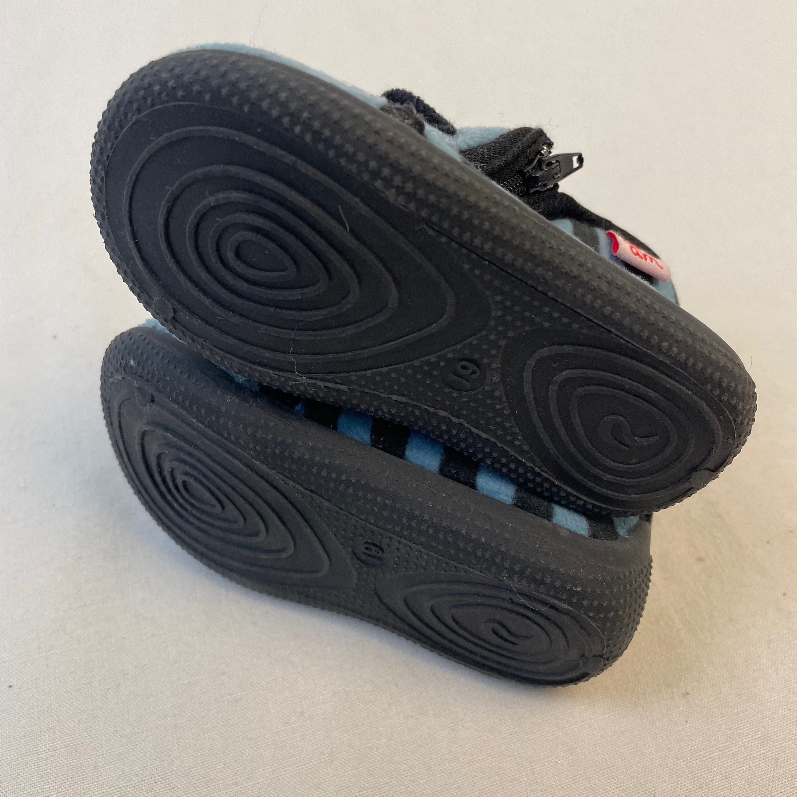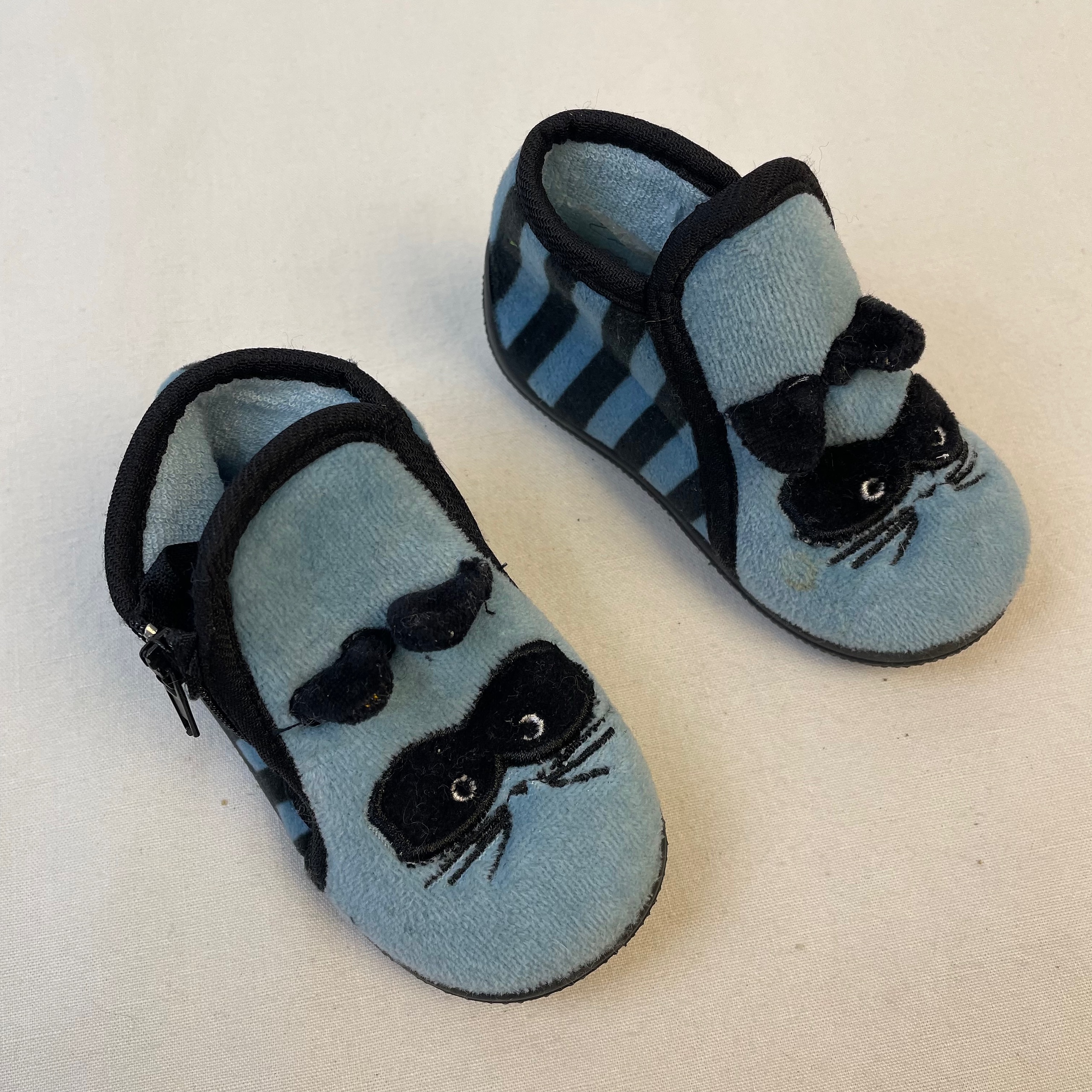 - Chaussons montants blau clair, motif chat masqué à petites oreilles en relief, fermeture par zip latéral.