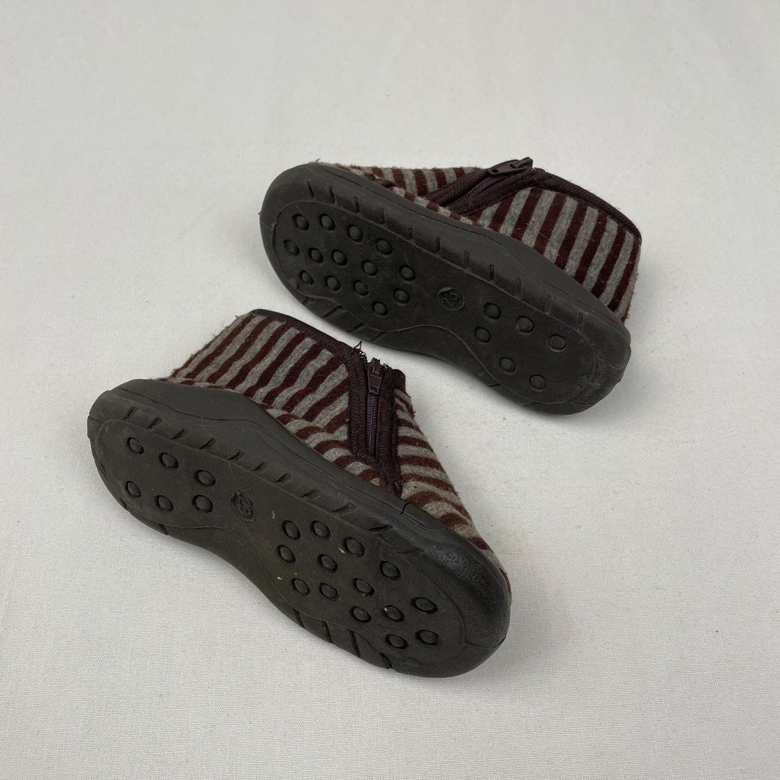 Autres commentaires : Chaussons montants, à rayures grises et marron, fermeture latérale par zip, doublure beige.