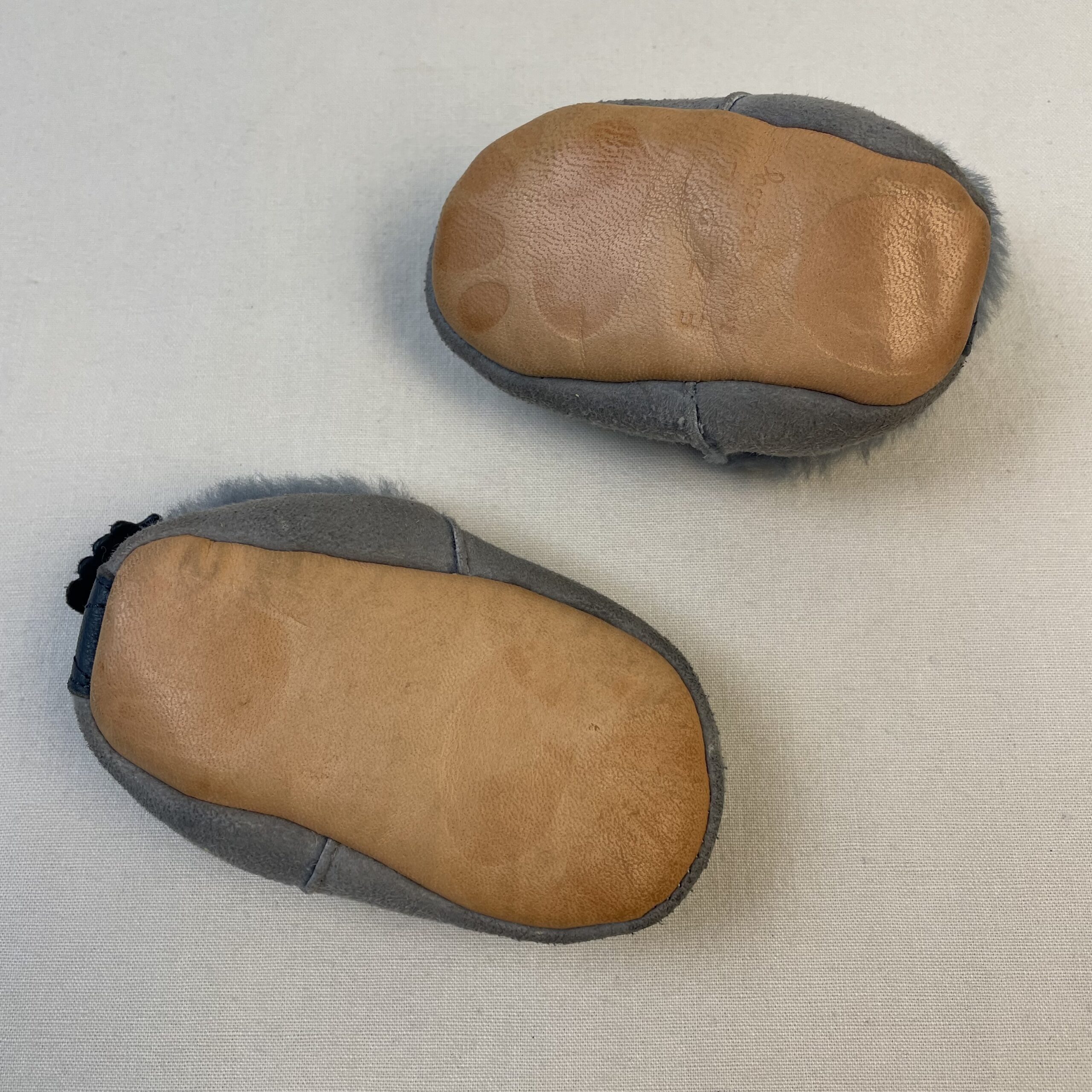 - Chaussons gris de bébé, aspect daim, fausse fourrure bleutée, élastiqués aux chevilles.