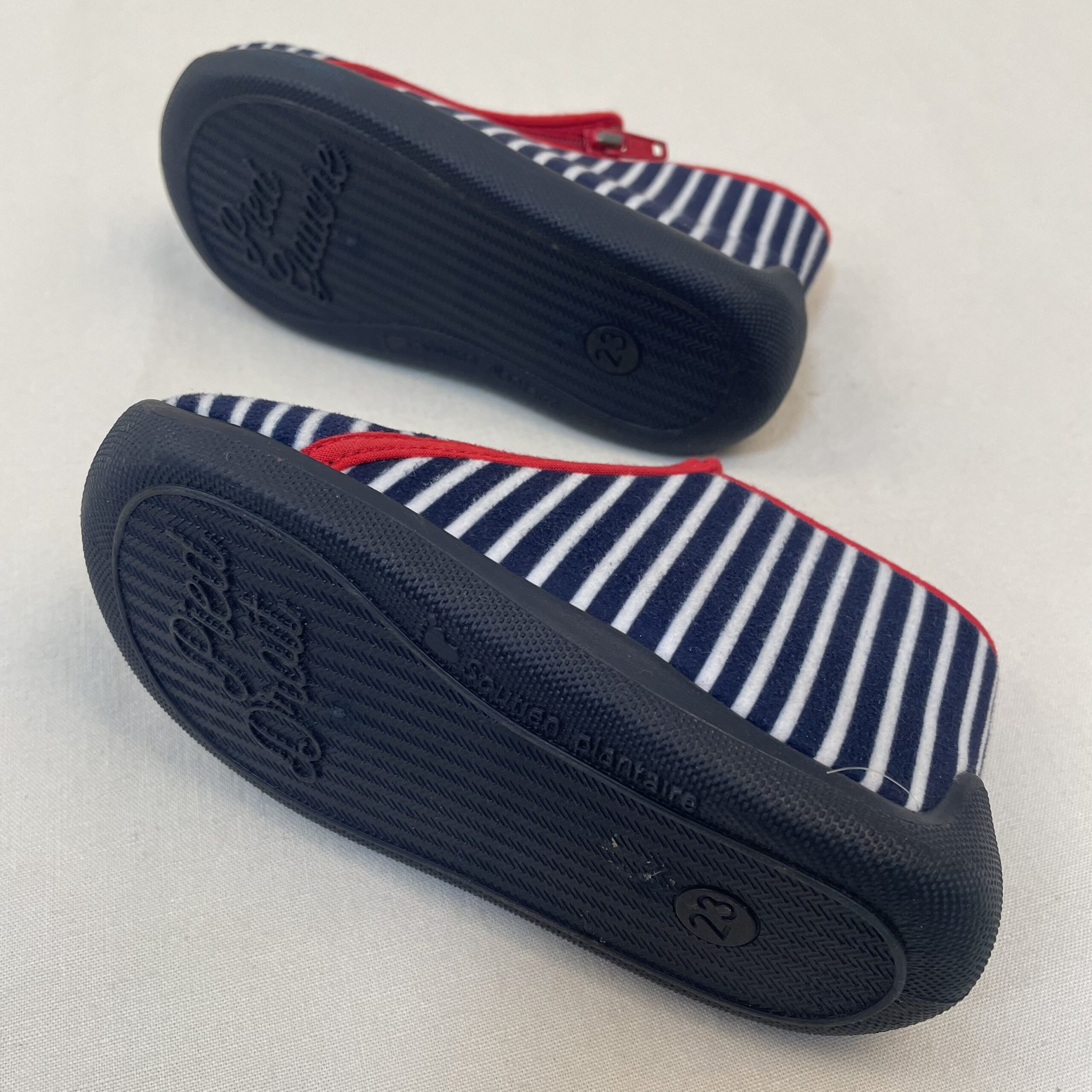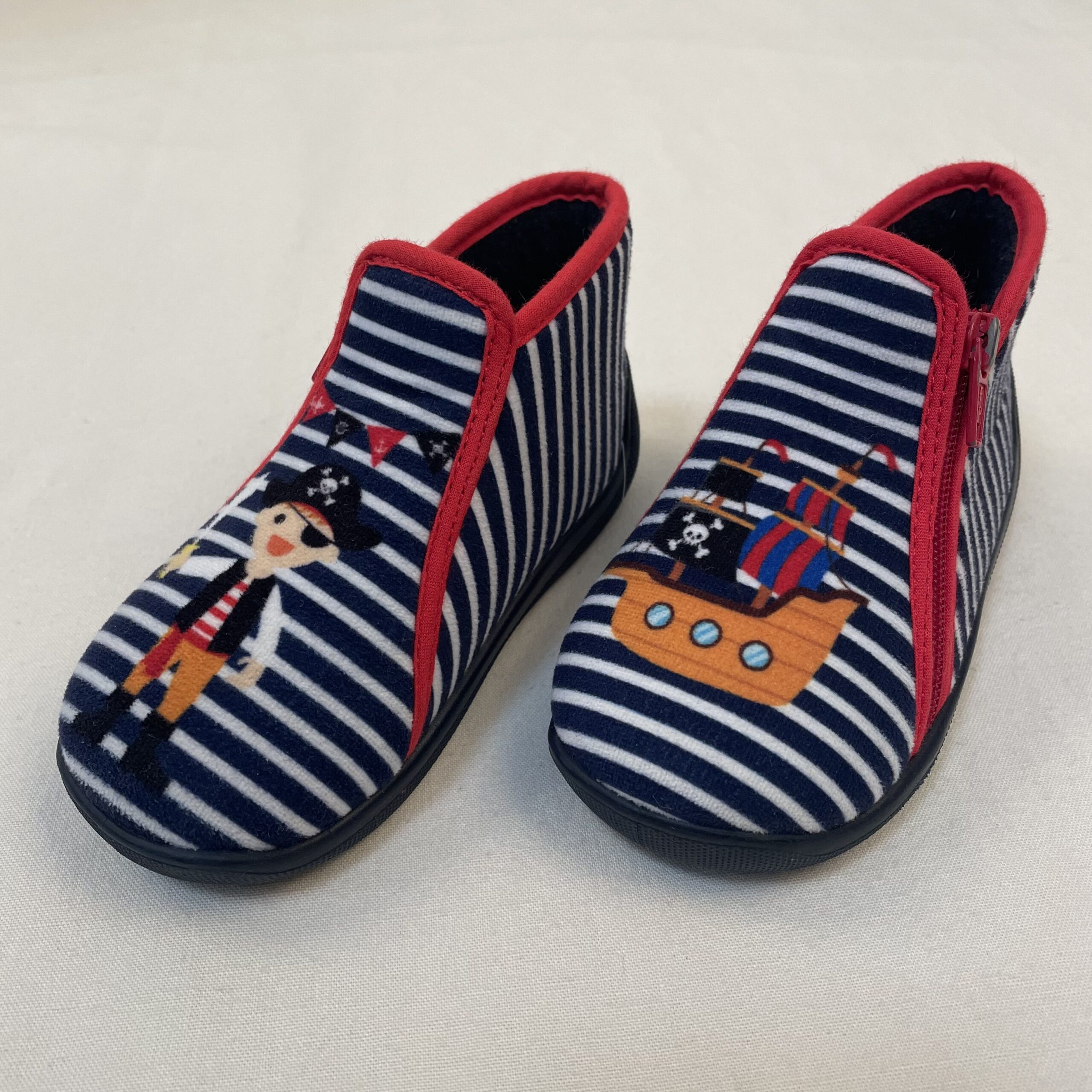 - Chaussons de petit pirate en velours bleu marine à rayures blanches, avec zip latéral rouge, indication pied droit, pied gauche sur la semelle.