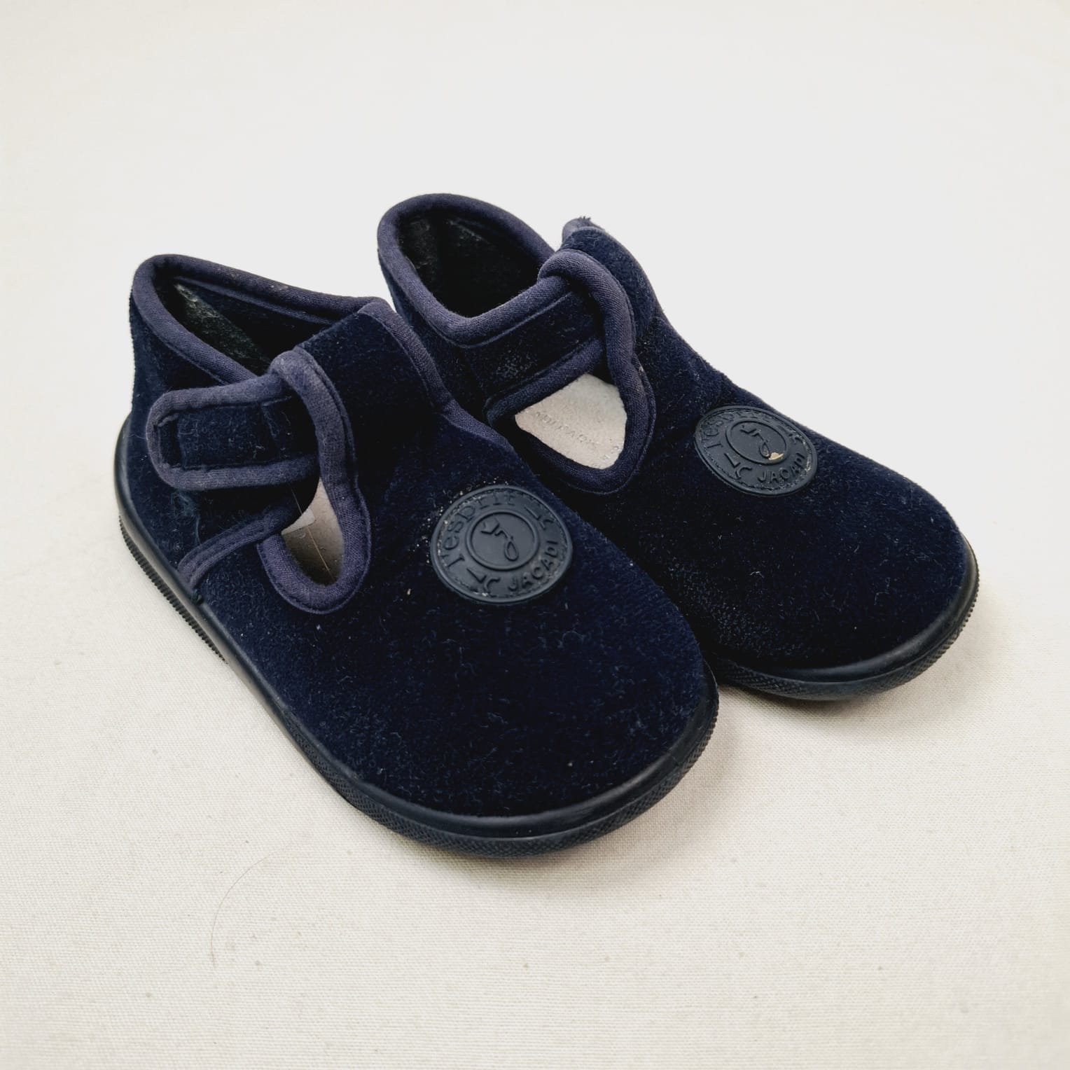 Autres commentaires : Chaussons en velours doux bleu foncé et animés d’un badge Jacadi en silicone, fermeture par bride velcro.