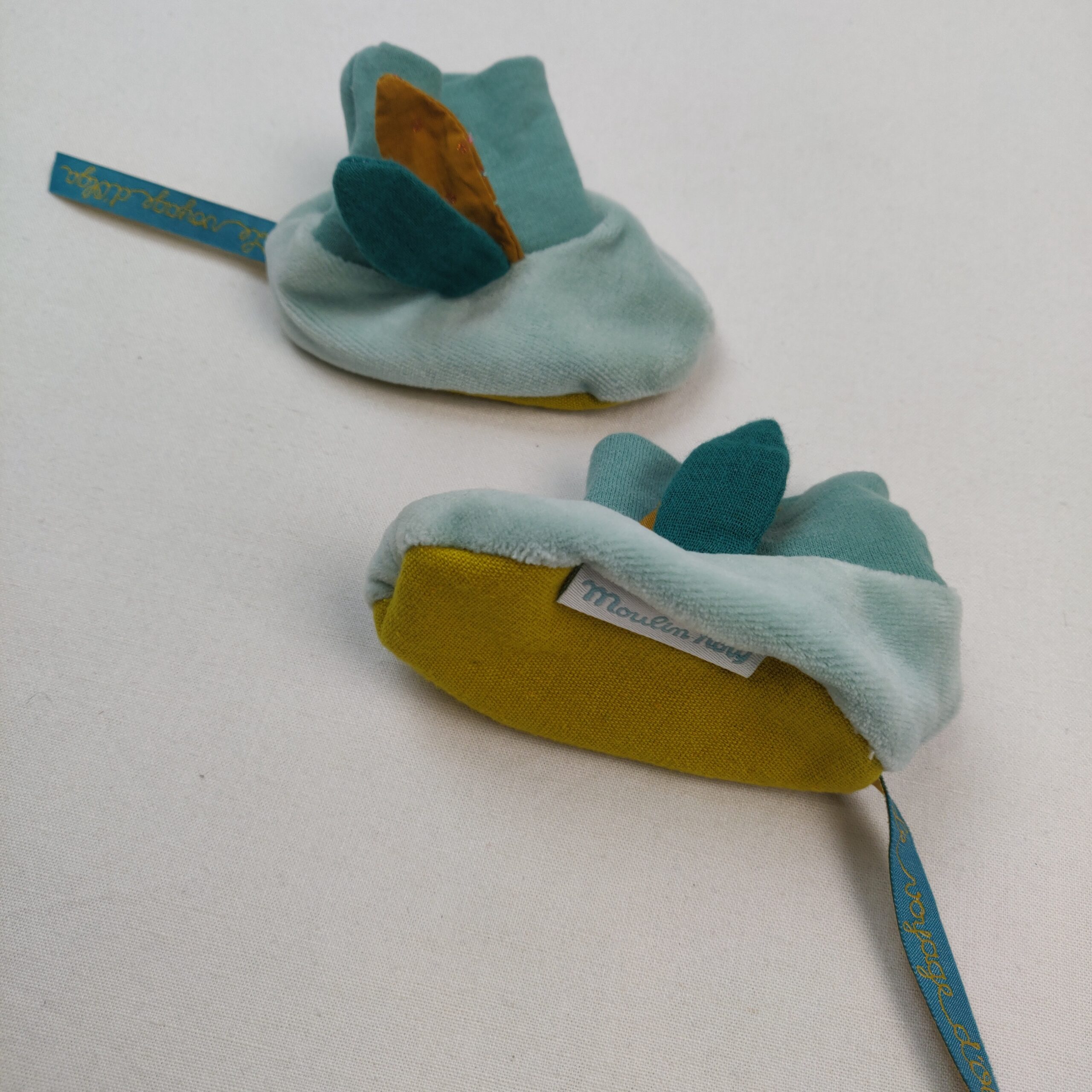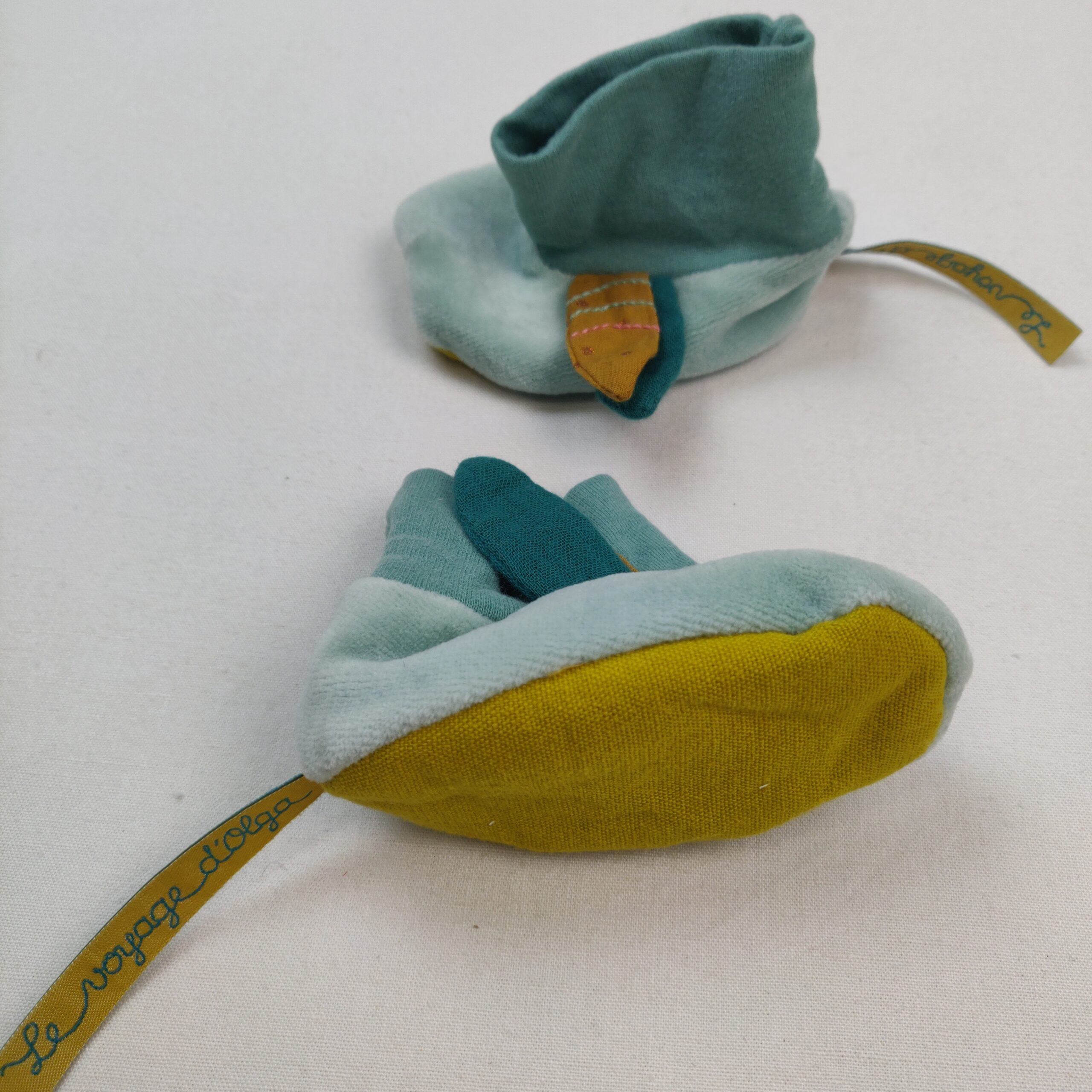 Autres commentaires : Chaussons souples et montants en velours (80% coton et 20% polyester) vert d’eau, partie montante en jersey 100% coton, dessous de pied en toile 79% coton et 21% lin, motif latéral en relief de feuilles ocres et vert sapin. Taille 0-6 mois. Collection Le voyage d’Olga.