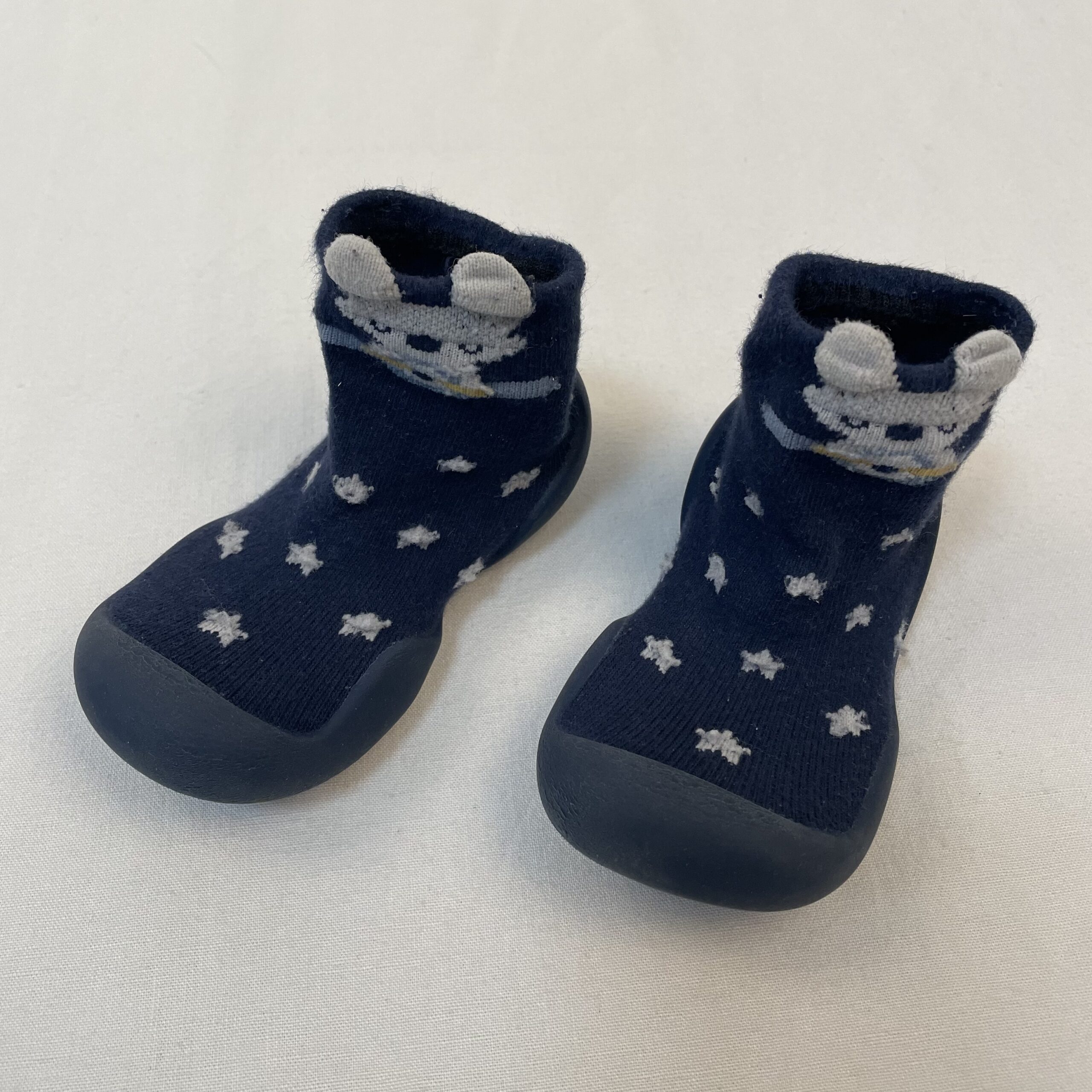 - Chaussons chaussettes bleu marine parsemés d’étoiles blanches, devant motif souris grise.