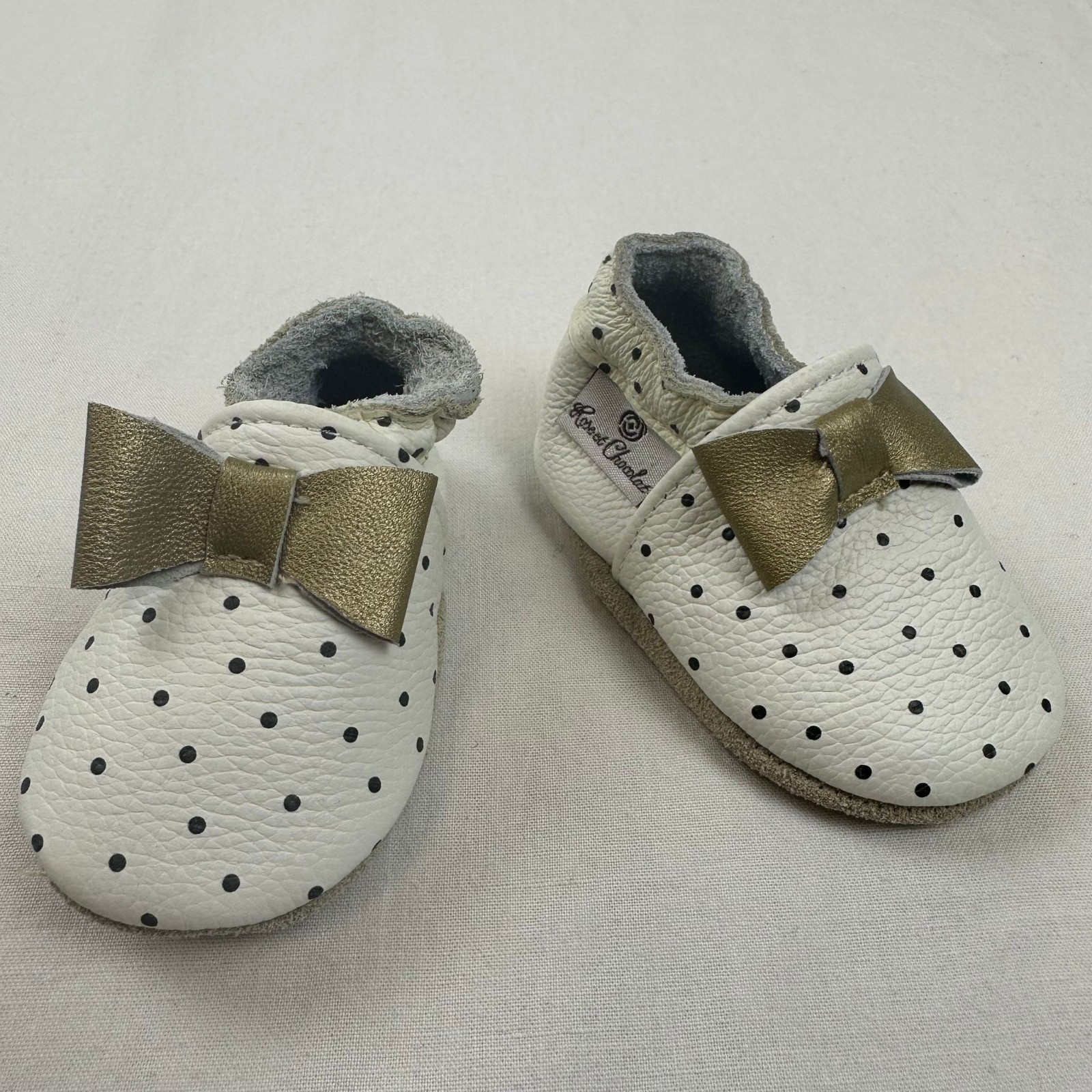Autres commentaires : Chaussons marron avec noeuds et des petits pointillés.