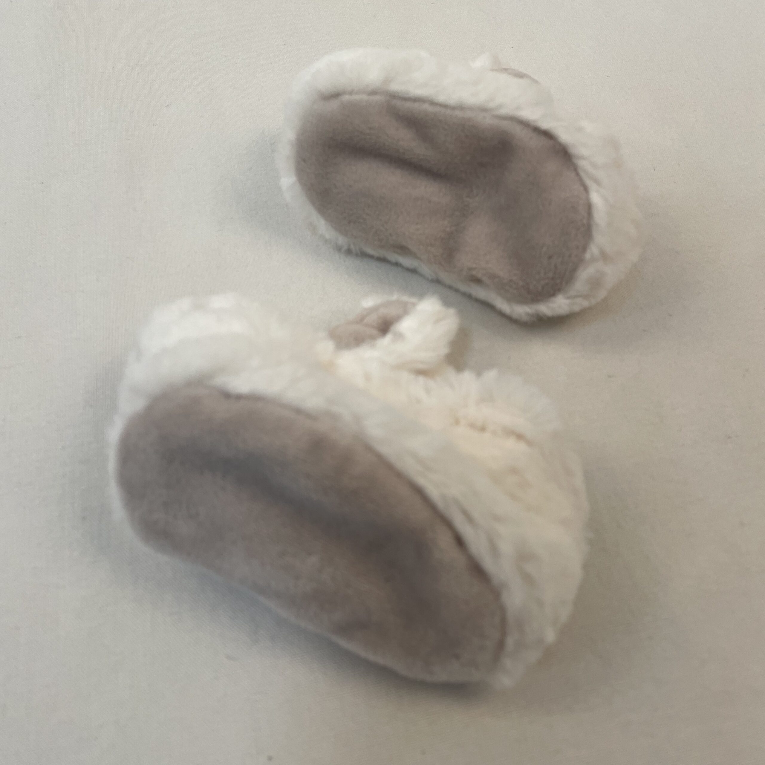 • Chaussons chauds de naissance en fourrure toute douce de couleur blanc écru, devant tête de lapin en relief, fourrure beige à l’intérieur et au niveau des oreilles et des semelles.