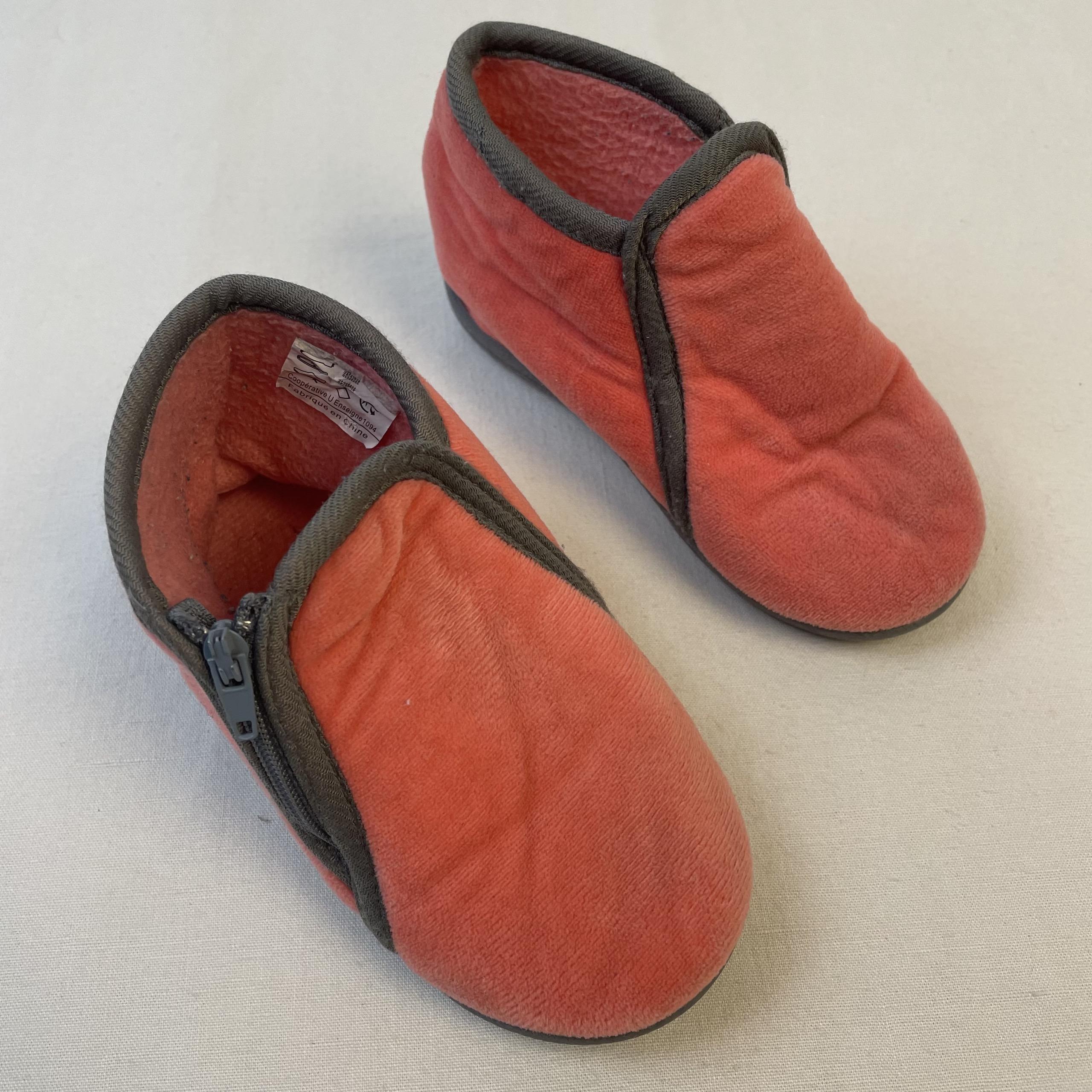 - Chaussons en velours orange, avec zip latéral gris