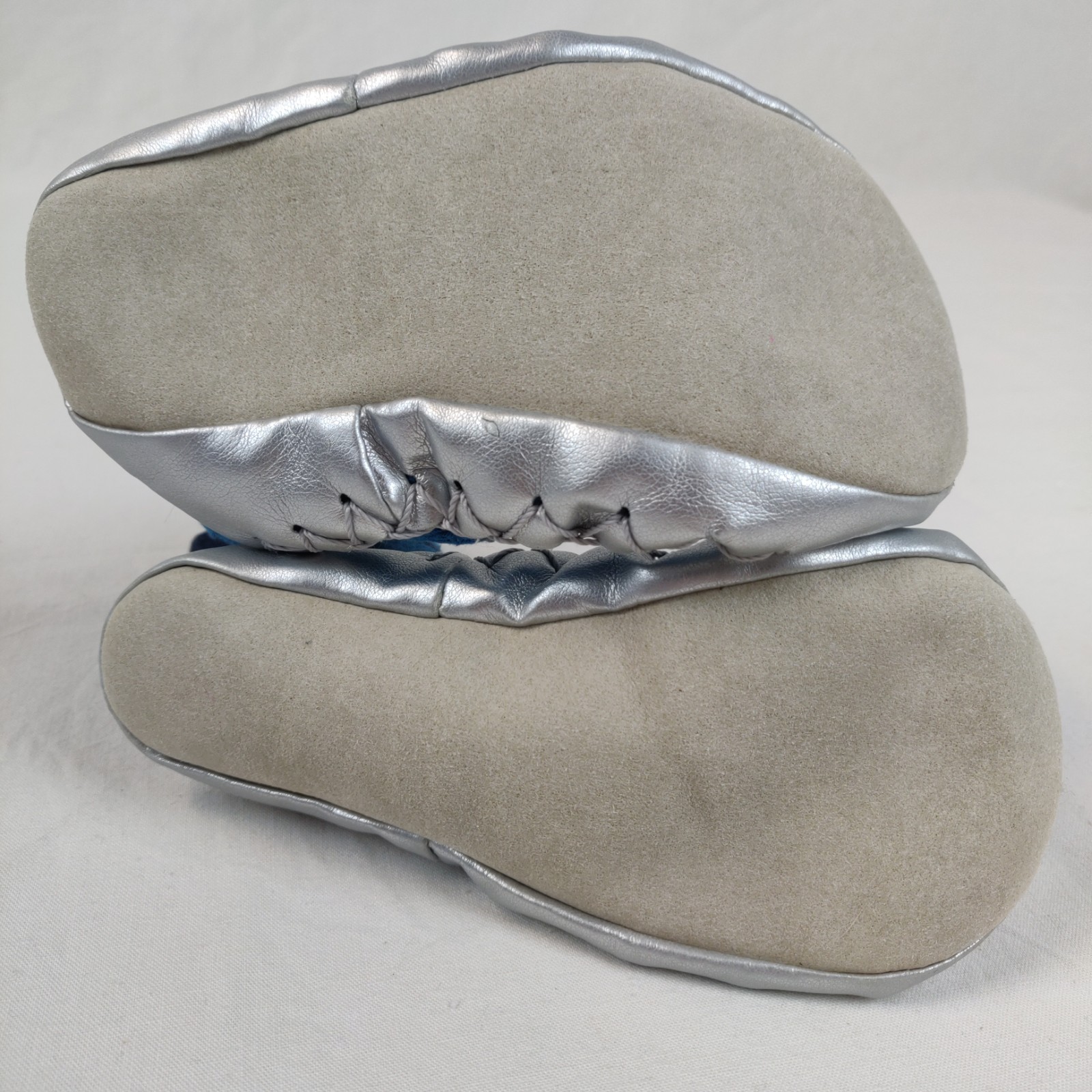 Autres commentaires : Chaussons-chaussures (taille estimée 30) – gris argenté et partie chaussette bleue à pois bleu marine.