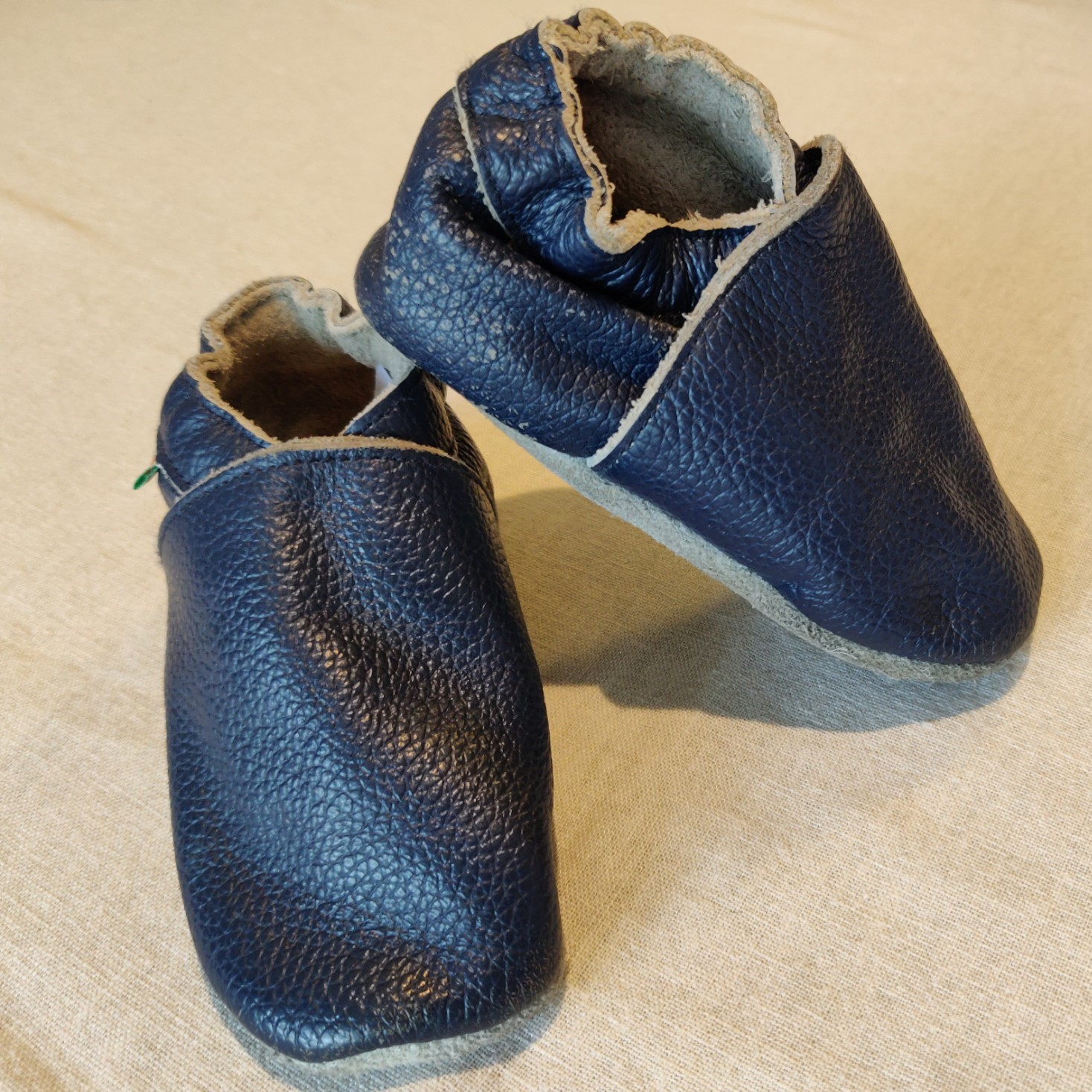 Autres commentaires : Chaussons semelle souple avec élastique autour de l’ouverture, parfaits pour l’apprentissage de la marche. En bon état, semelles à peine tachées, cuir bleu marine un peu décoloré aux talons.