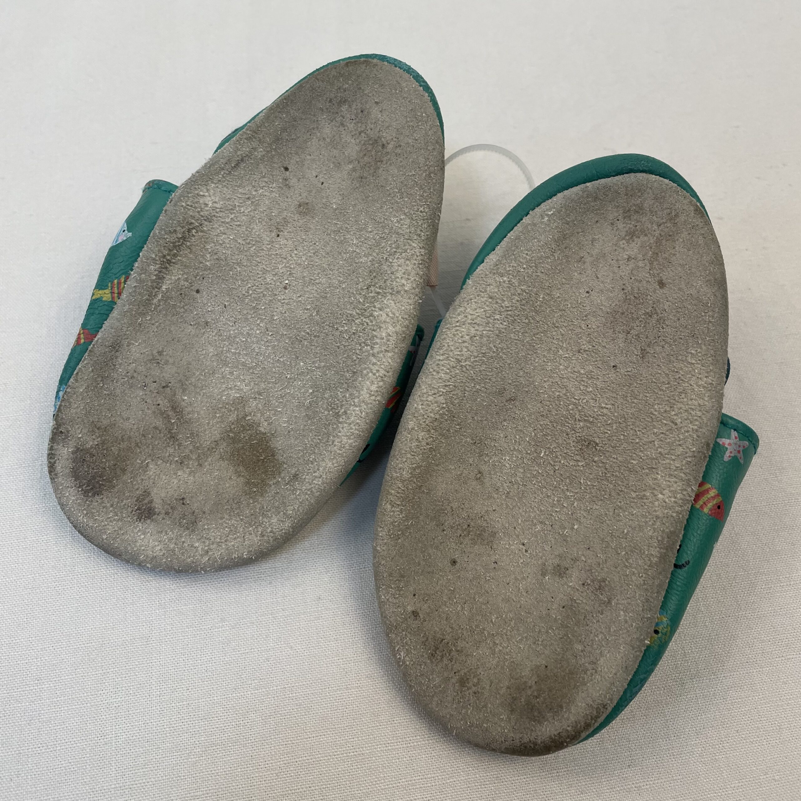 - Chaussons en cuir souple vert, parsemé de petits poissons colorés, élastiqués derrière.