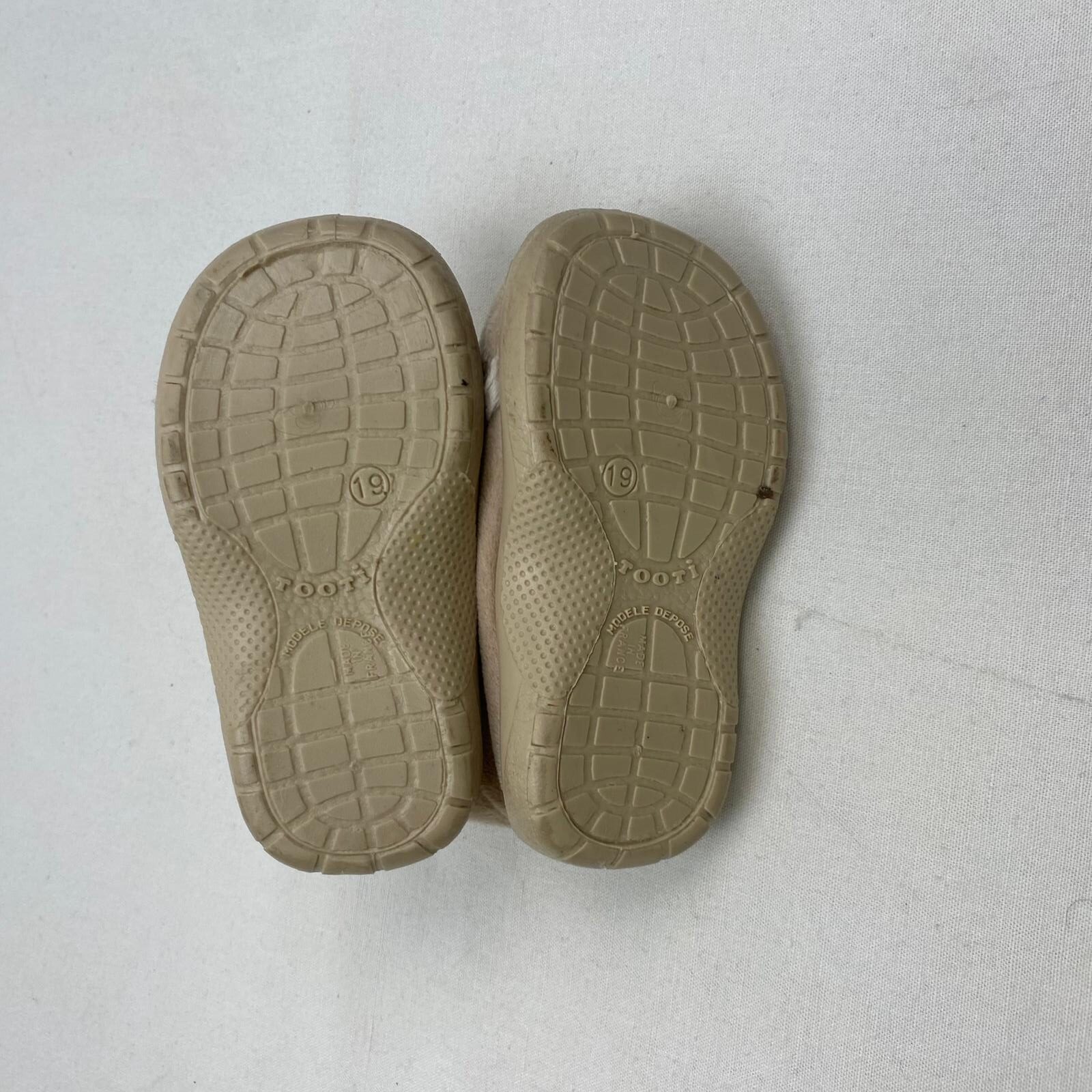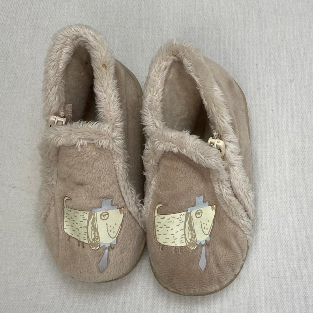 Autres commentaires : Chaussons zippés en velours beige, motif chien.