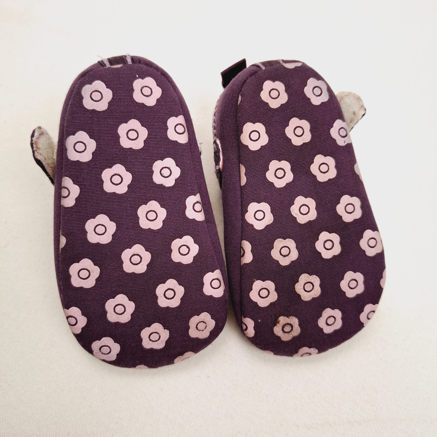 Autres commentaires : Chaussures ouvertes à scratch violettes avec des motifs de fleurs et de papillons.