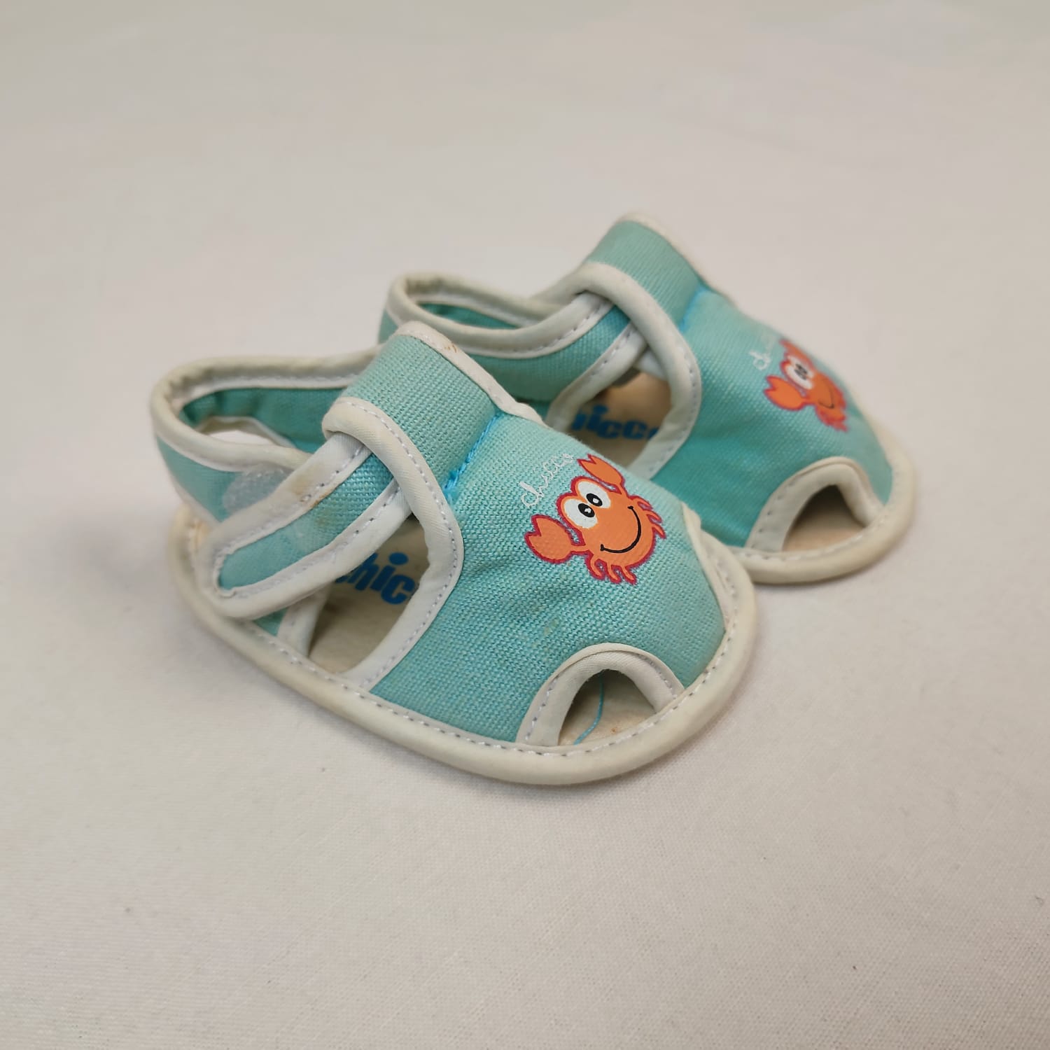 Autres commentaires : Sandales souples en toile bleu clair, motif crabe, arrondi et un peu ouvert au bout, fermeture par scratch, semelles à picots antidérapants.