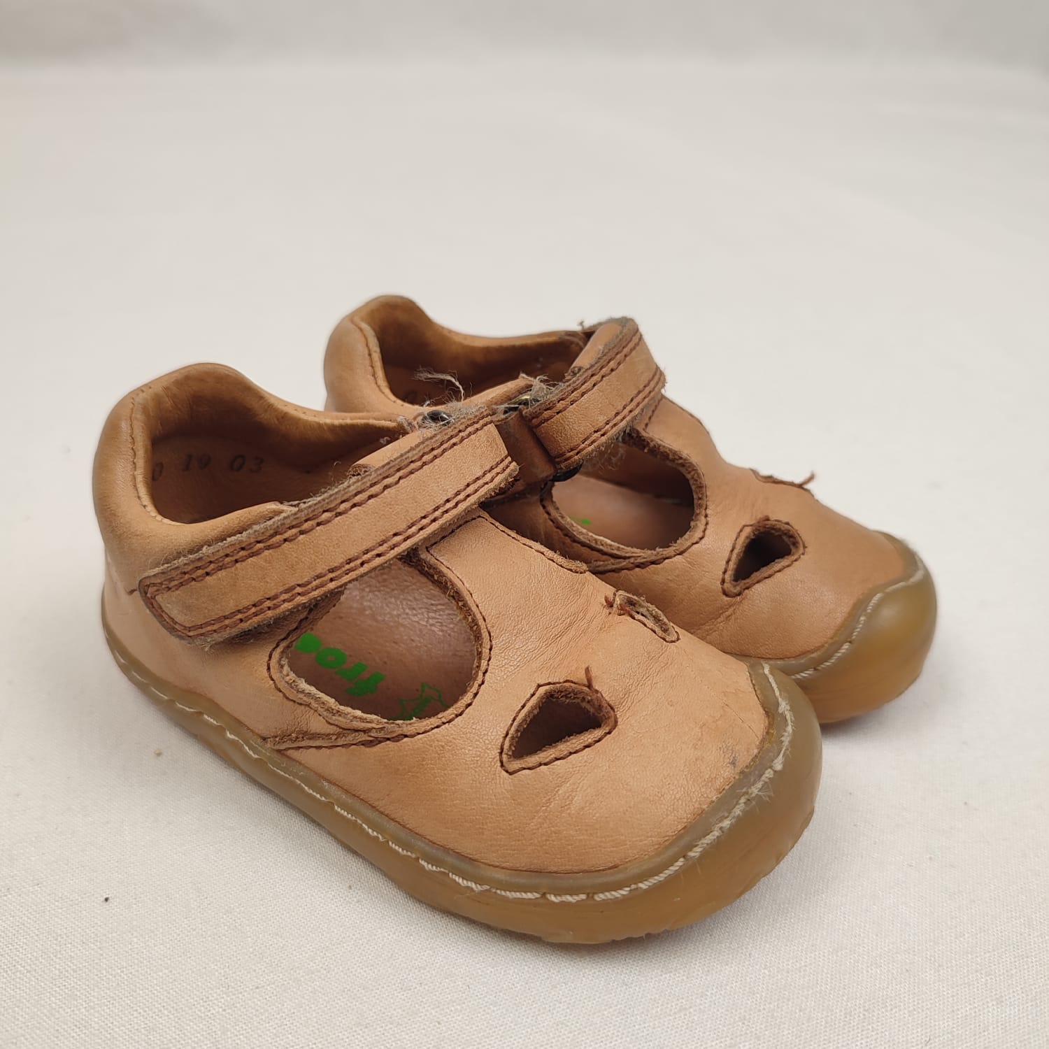 Autres commentaires : Chaussures en cuir camel, fermeture par scratch, semelles en caoutchouc.