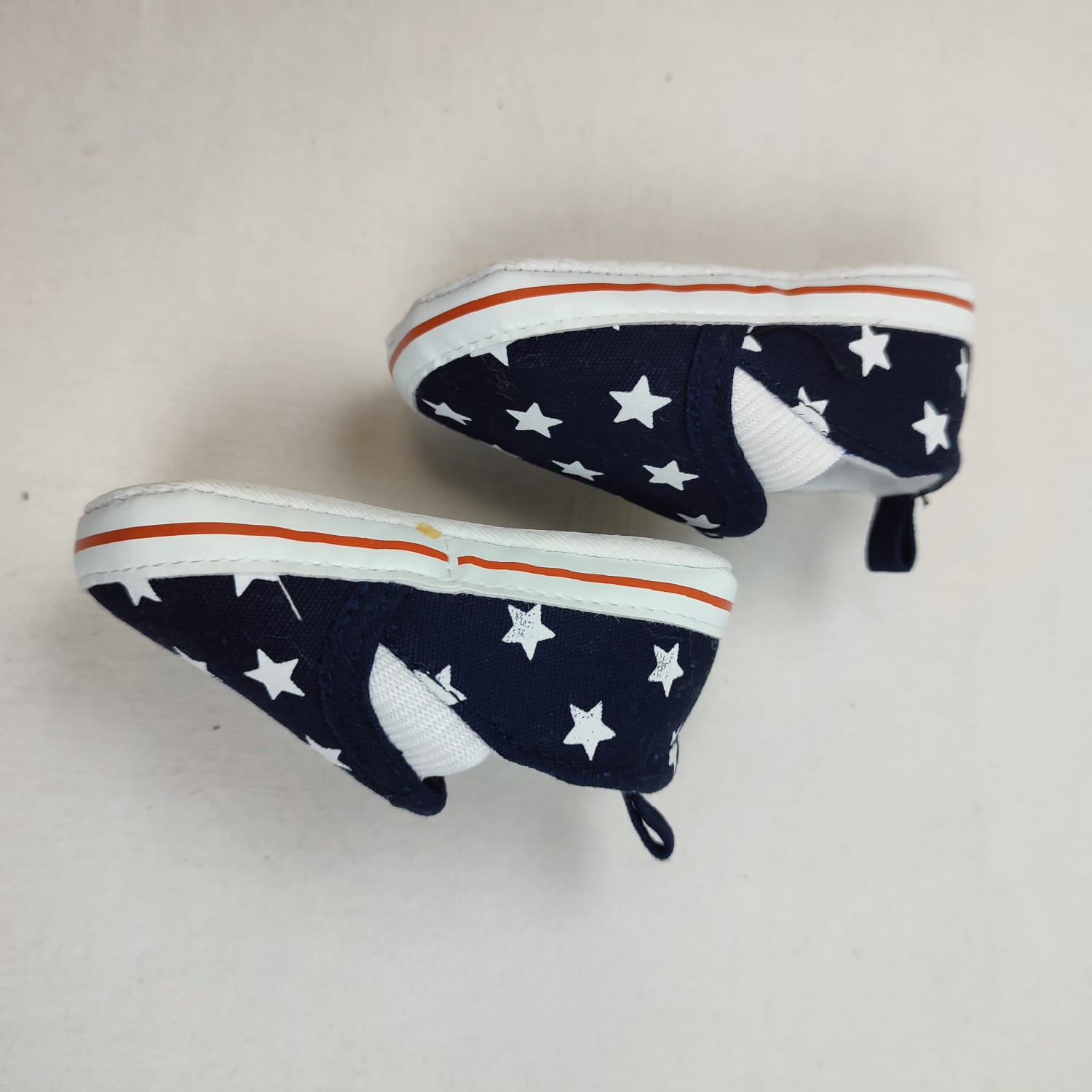 Autres commentaires : Chaussures en toile élastiquées bleu marine avec étoiles blanches, liseré rouge sur le bord blanc de la semelle, style USA, semelles blanches en tissu munies de minuscules picots anti-dérapants.