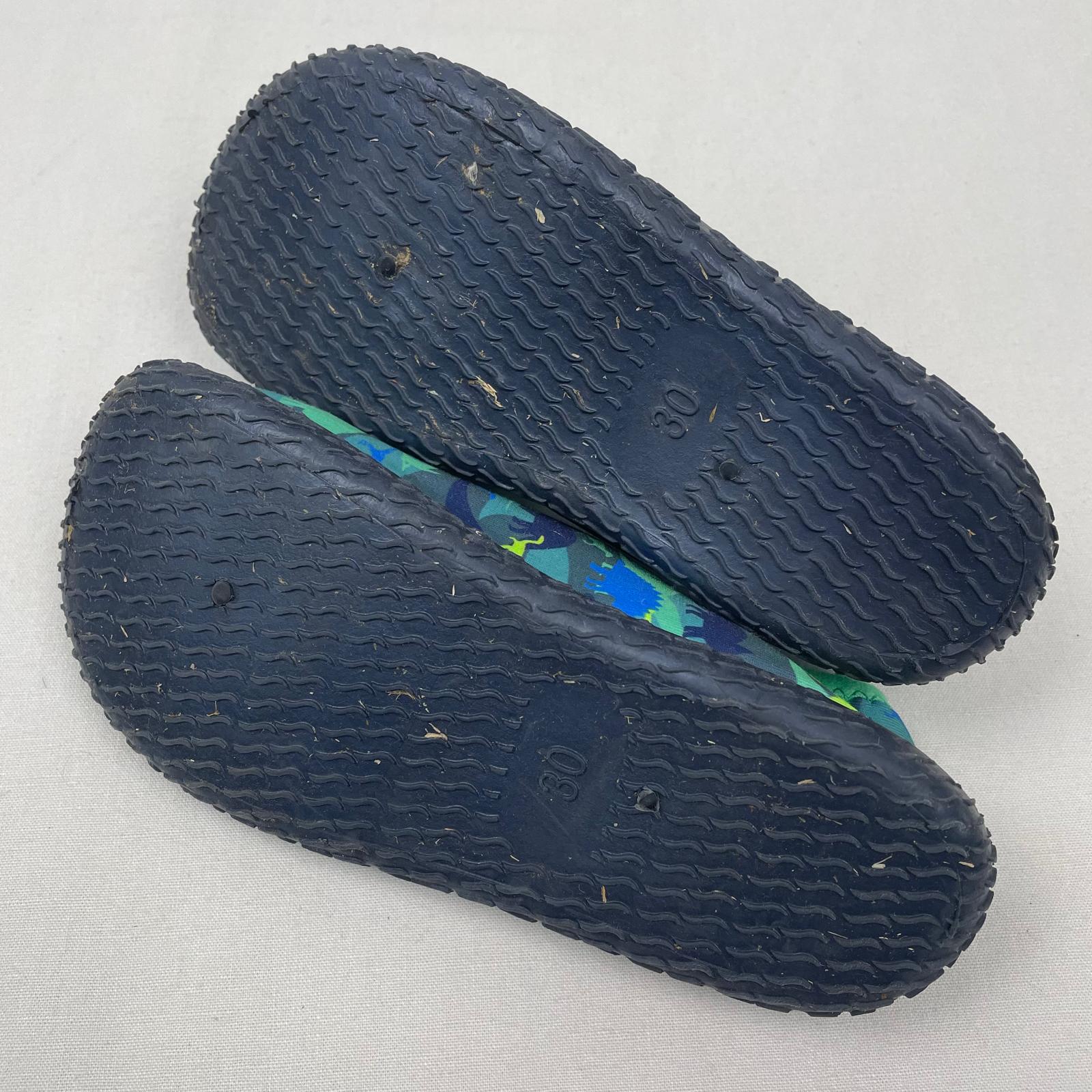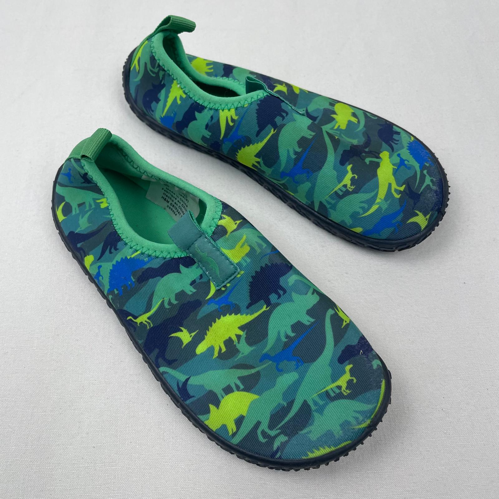 Autres commentaires : Chaussures d’eau, style camouflage militaire en dinosaures jaunes et verts, élastiquées.