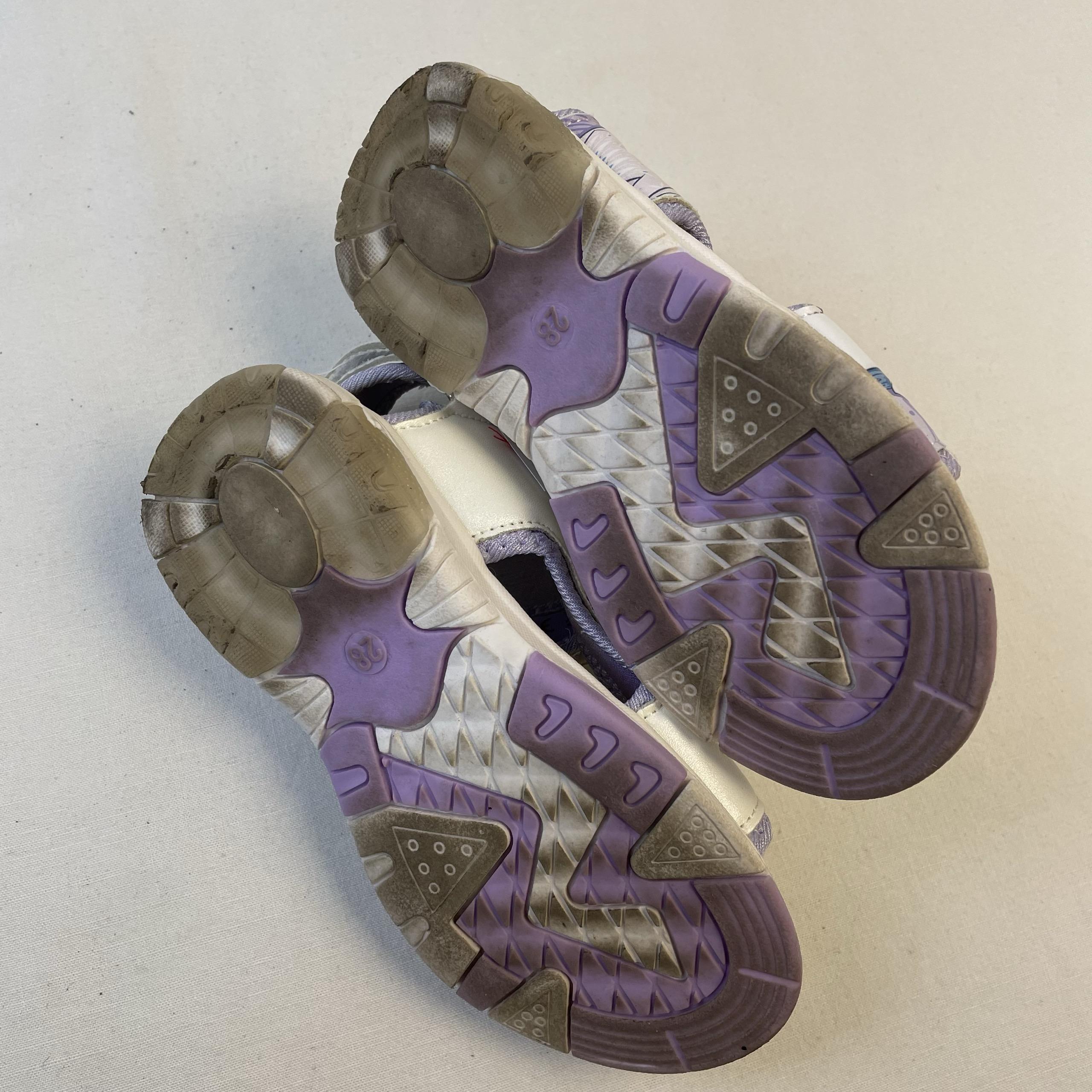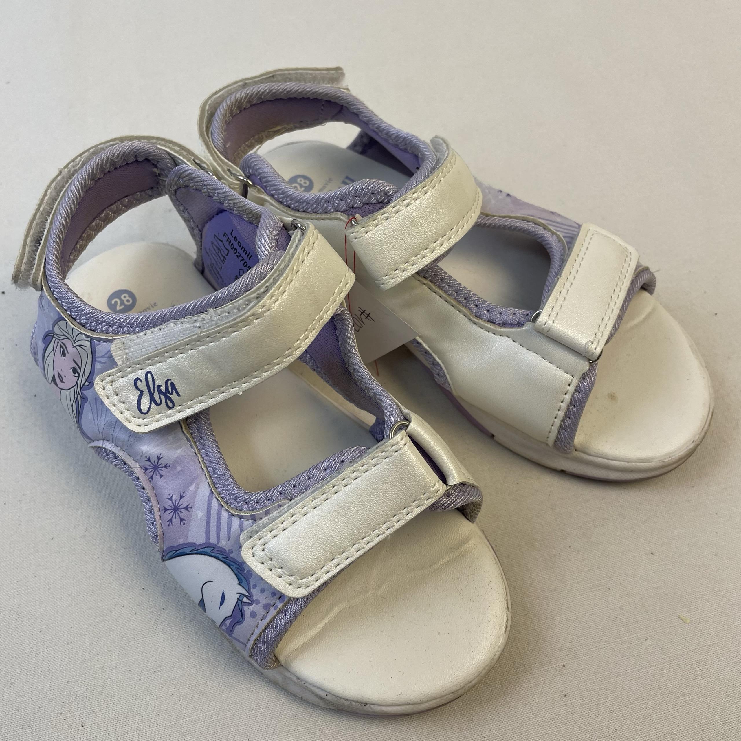 - Sandales blanches et parme, ajustables derrière et au-dessus par 3 scratchs. Thème : Reine des Neiges.