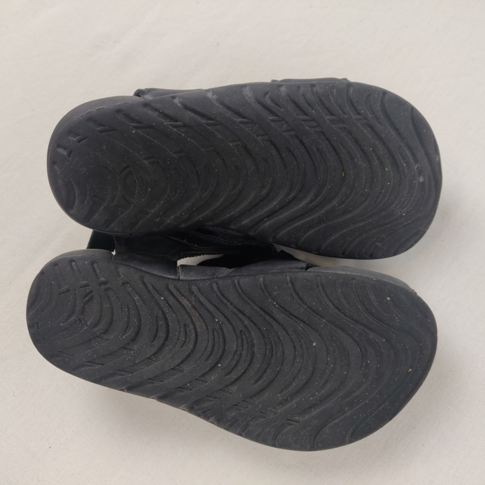 Autres commentaires : Sandales noir en cuir synthétique, semelle en caoutchouc et une double fermeture en scratch.