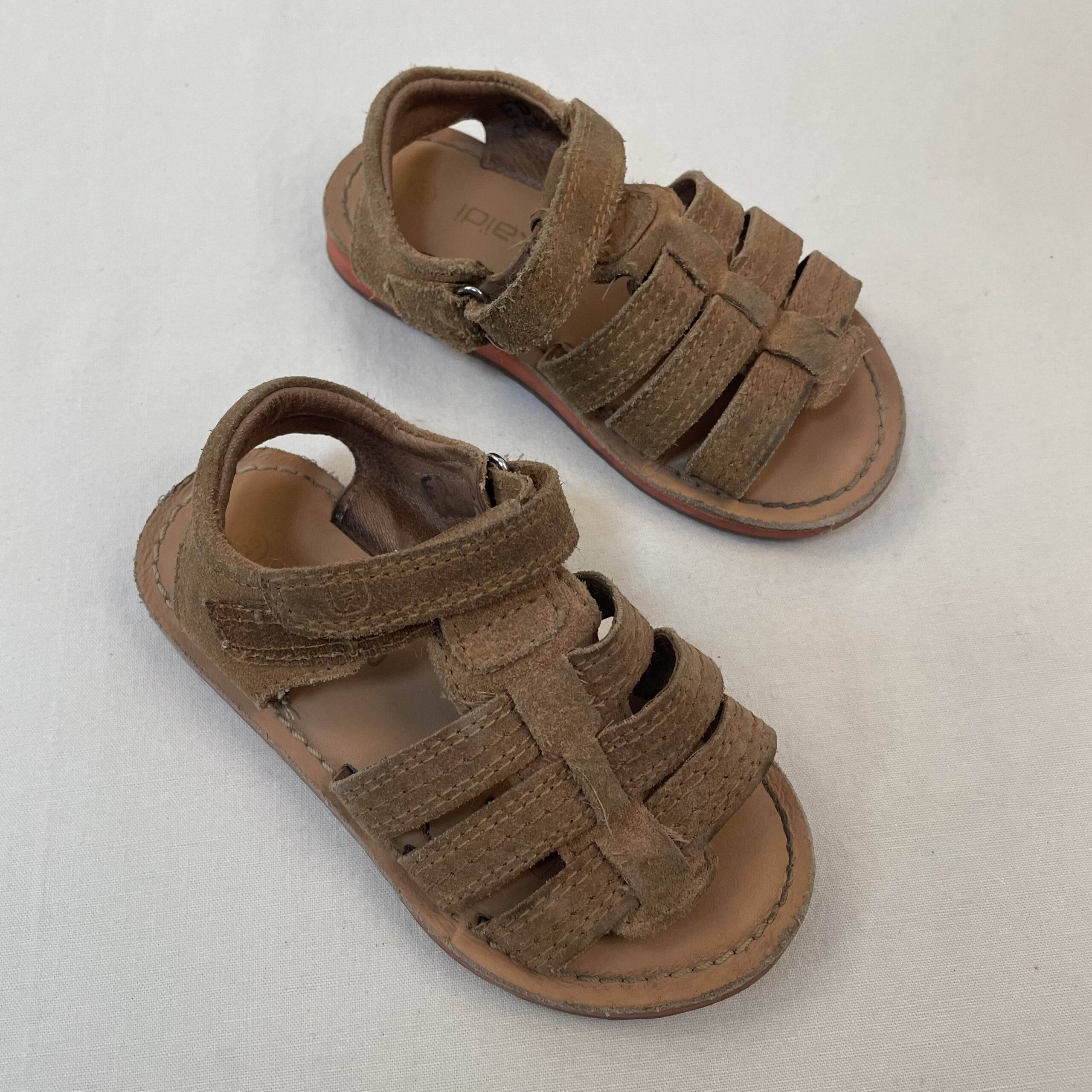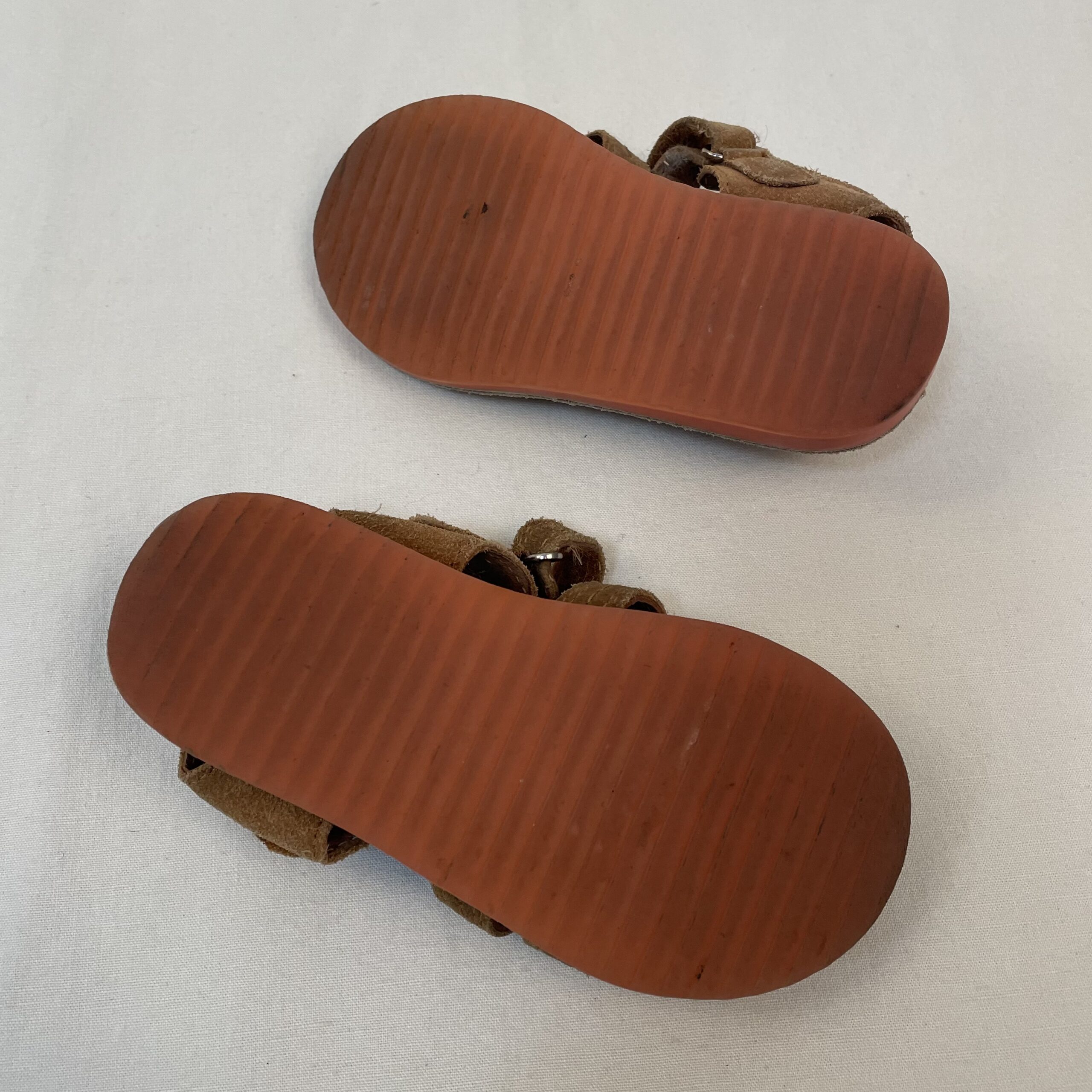 - Sandales style daim couleur camel, fermeture latérale par scratch.