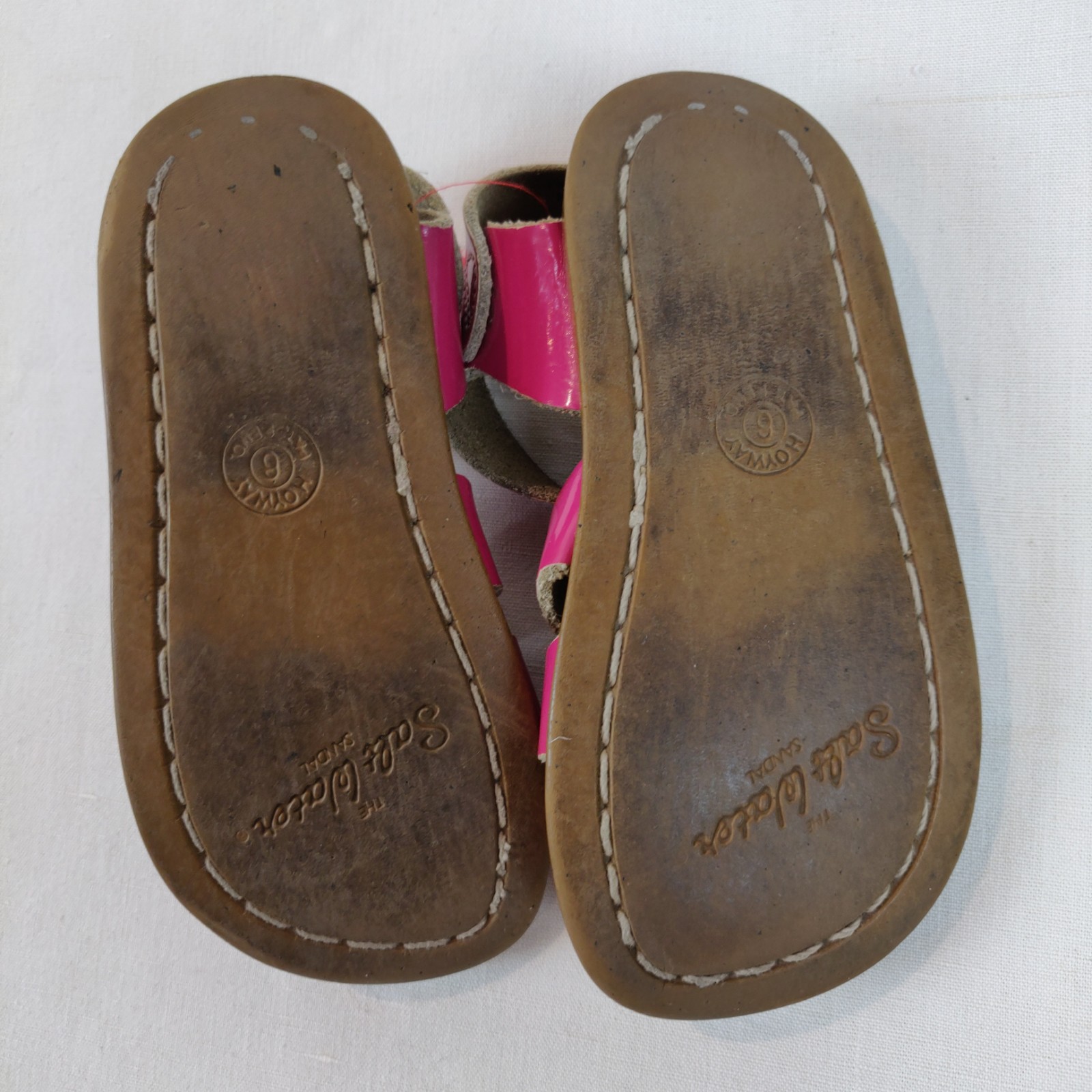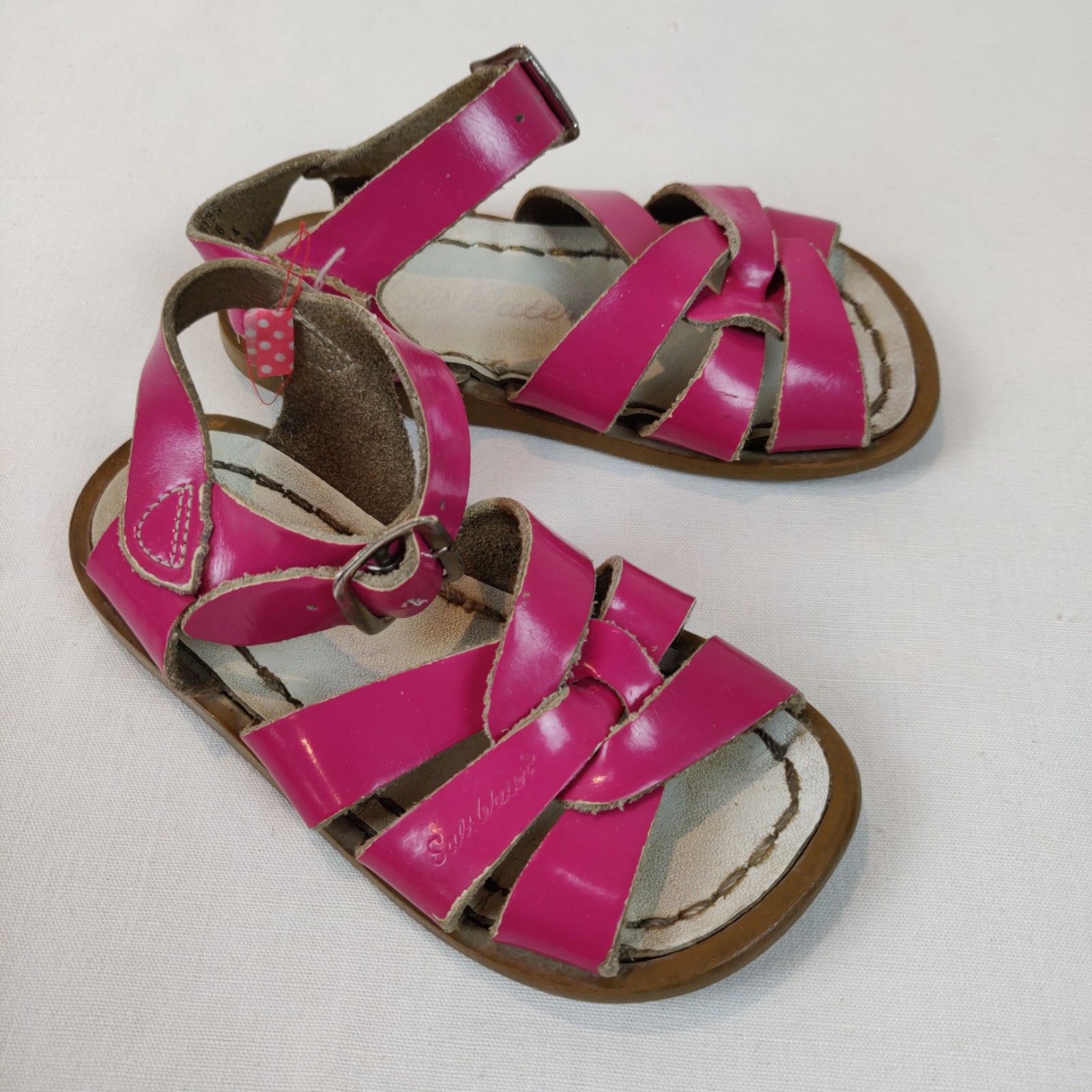 Autres commentaires : Nu-pieds – rose fuschia – fermeture classique à languette. Taille 23 estimée – taille 6 USA. Un peu usées mais très résistantes du fait de leur qualité. Niveau baissé de banane à fraise.