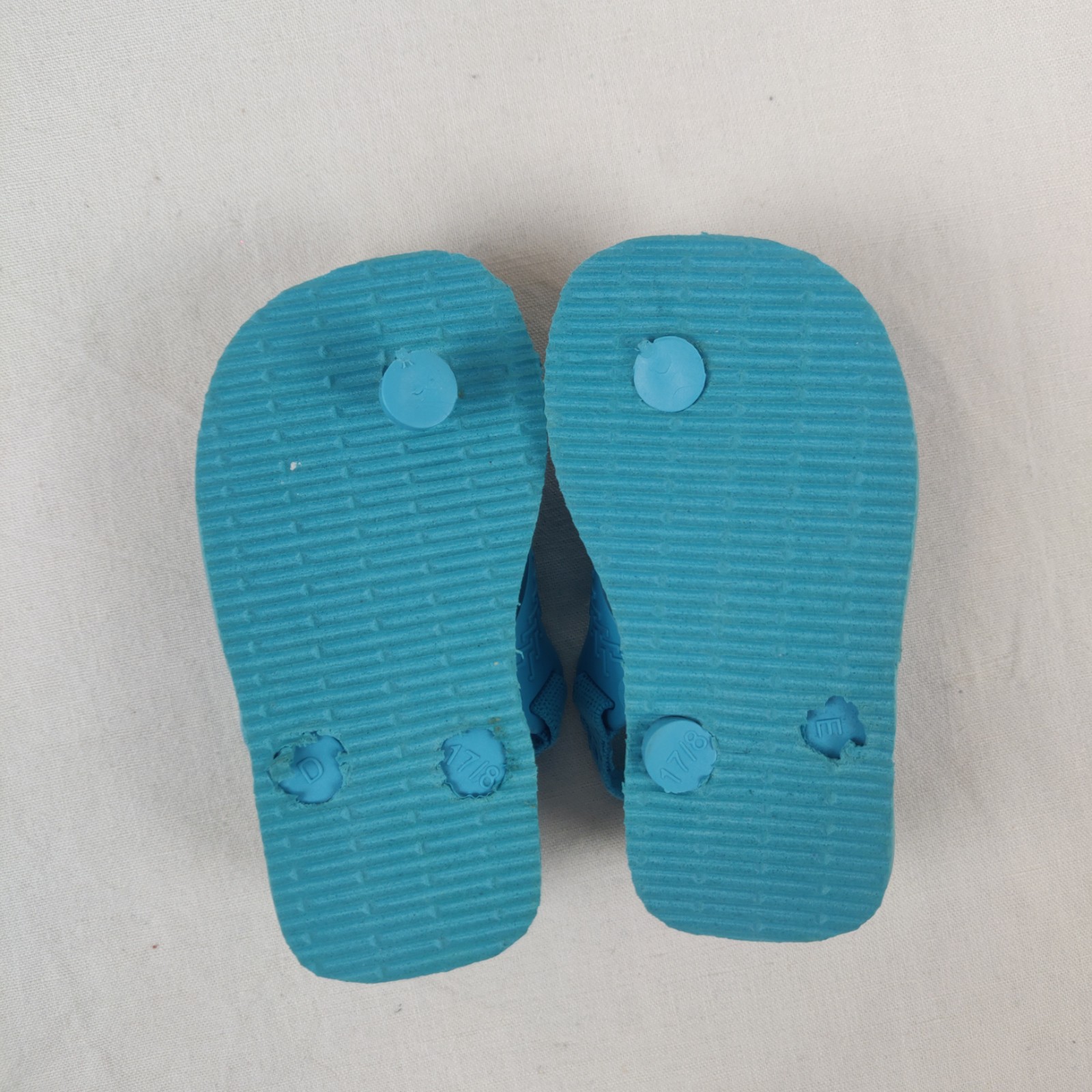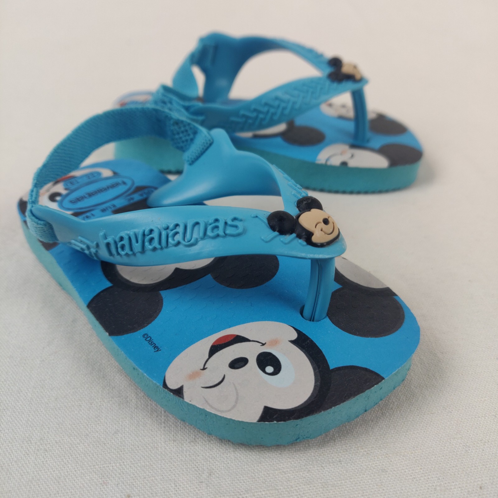 Autres commentaires : Tongs bleu ciel avec tête de Mickey. Talon élastiqué. Jamais portées.